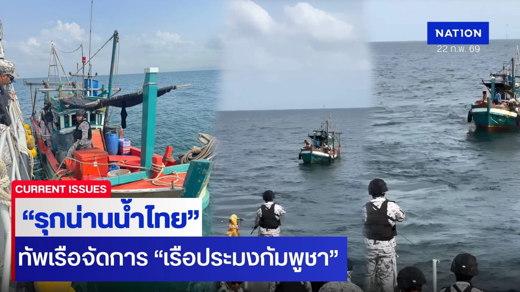 22 กุมภาพันธ์ 2569 ทัพเรือภาคที่ 1 โดยผู้บังคับการเรือ ต.996 แจ้งเหตุการณ์จับกุมเรือประมงสัญชาติกัมพูชา 1 ลำ บริเวณพิกัดละติจูด 11°31.51’ เหนือ และลองจิจูด 102°53.40’ ตะวันออก ในเขตน่านน้ำไทย