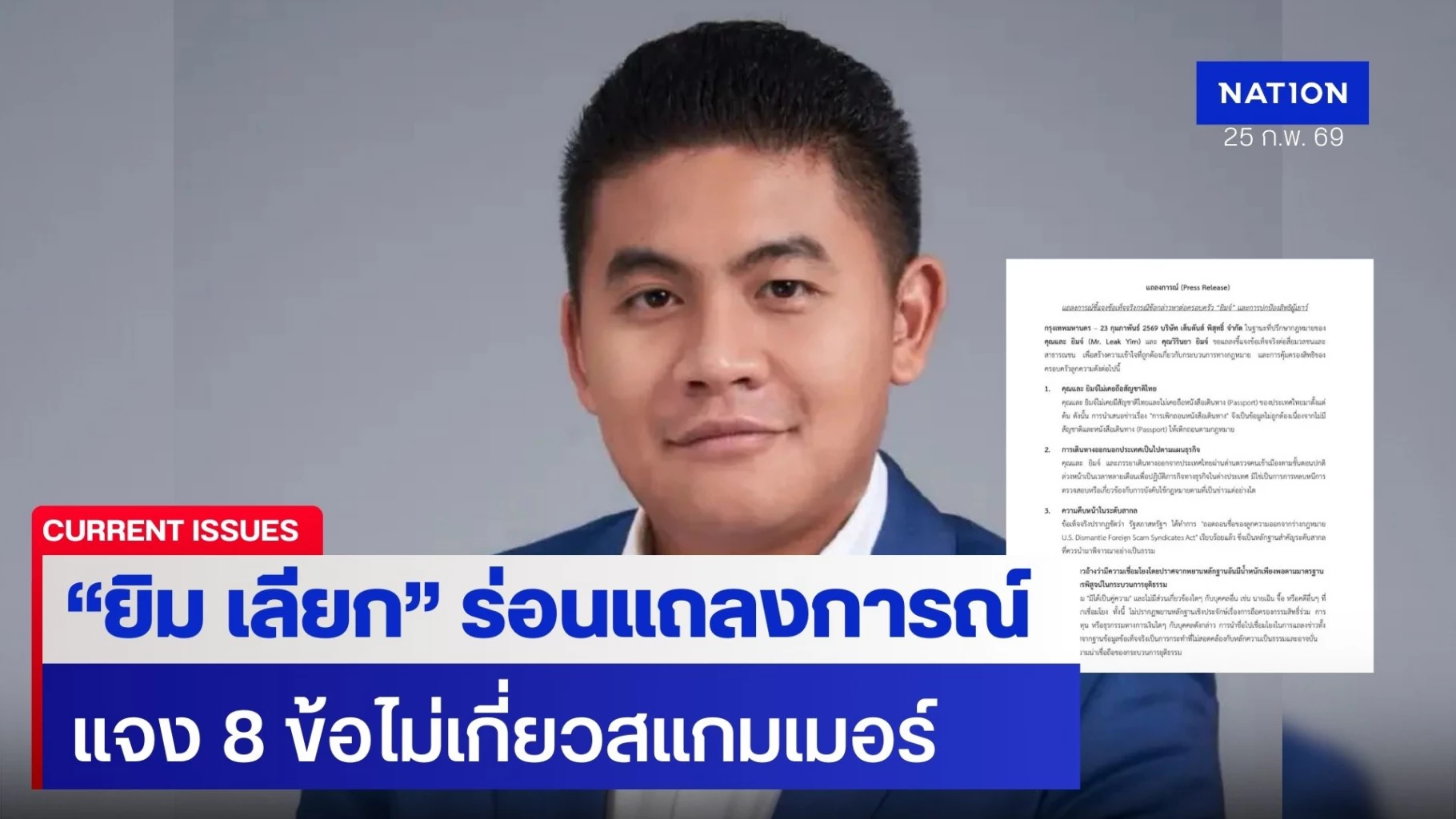 “ยิม เลียก” ร่อนแถลงการณ์ แจง 8 ข้อ ไม่เกี่ยว “สแกมเมอร์ – เฉินจื้อ”