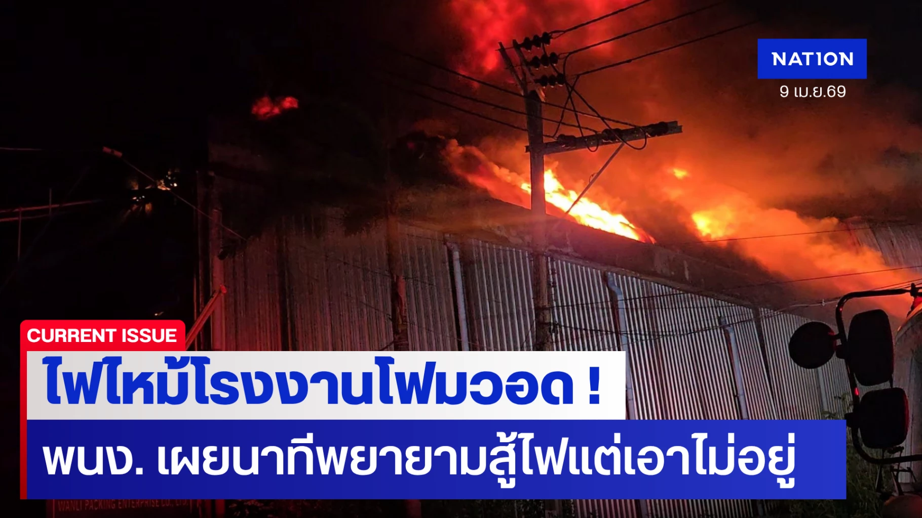 9 เมษายน 2569 ผู้สื่อข่าวรายงานว่า เมื่อวานนี้ (8 เมษายน 2569) เวลา 19.30 น. เกิดเหตุเพลิงไหม้รุนแรงภายใน บริษัท ว่านลี่ แพ็คกิ้ง เอ็นเตอร์ไพรส จำกัด ตั้งอยู่พื้นที่หมู่ 4 ถนนบางนา-ตราด กม.13 ตำบลบางโฉลง อำเภอบางพลี จังหวัดสมุทรปราการ ซึ่งเป็นโรงงานอุตสาหกรรมผลิตโฟมและบรรจุภัณฑ์ขนาดใหญ่ ส่งผลให้กลุ่มควันสีดำพวยพุ่งเหนือท้องฟ้ามองเห็นได้แต่ไกล