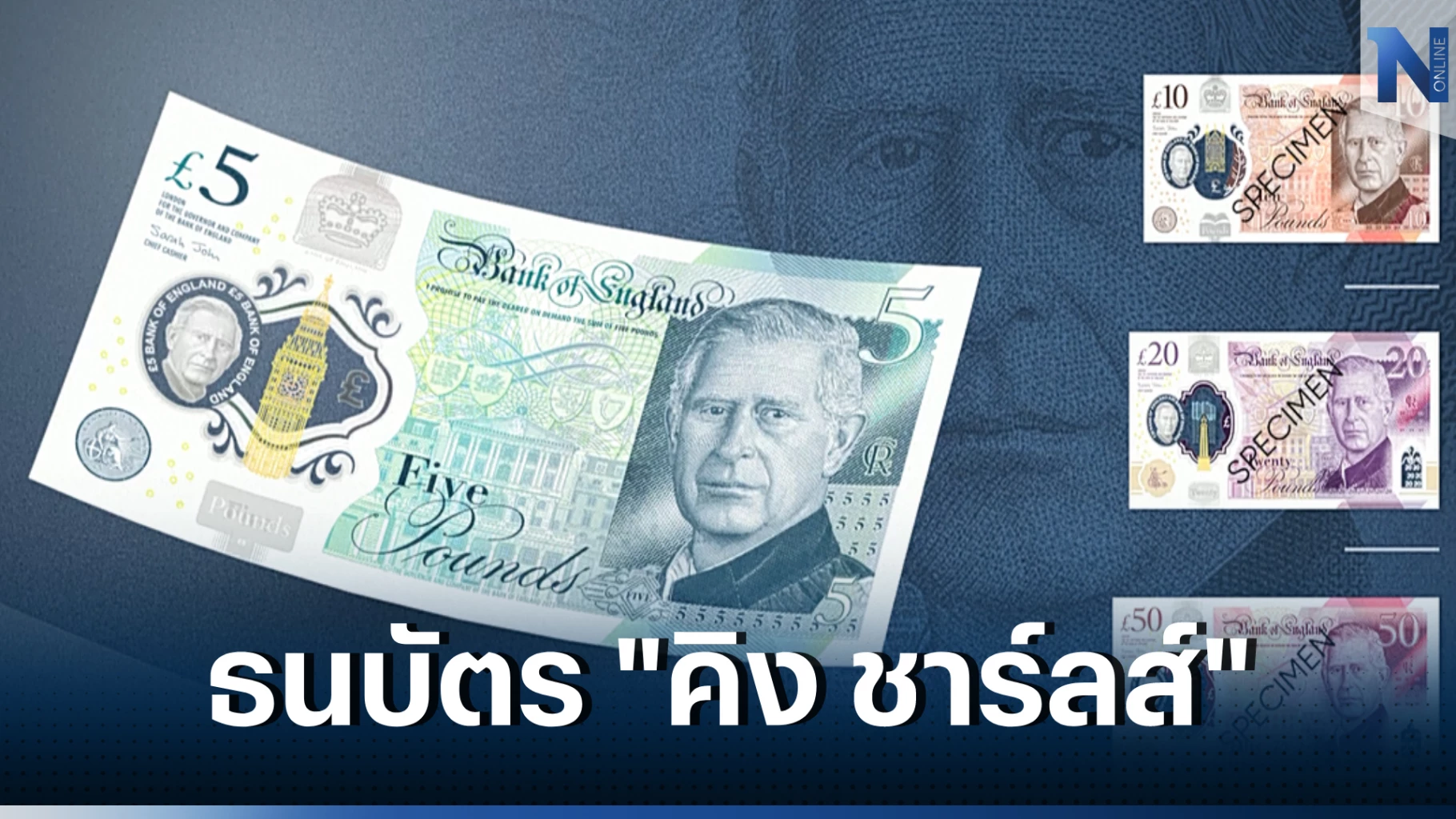 ธนาคารกลางอังกฤษเผยภาพของธนบัตรใหม่ 4 ฉบับ ที่มีพระบรมฉายาสาทิสลักษณ์ของพระเจ้าชาร์ลส์ ที่ 3 ปรากฏอยู่บนด้านหน้าและบนช่องโปร่งใสของธนบัตรเมื่อวันจันทร์ ประกอบด้วย ธนบัตรมูลค่า 5 ปอนด์, 10 ปอนด์, 20 ปอนด์ และ 50 ปอนด์ และระบุว่า ธนบัตรใหม่อาจเริ่มนำออกมาใช้ในระบบการเงินของอังกฤษช่วงกลางปี 2567