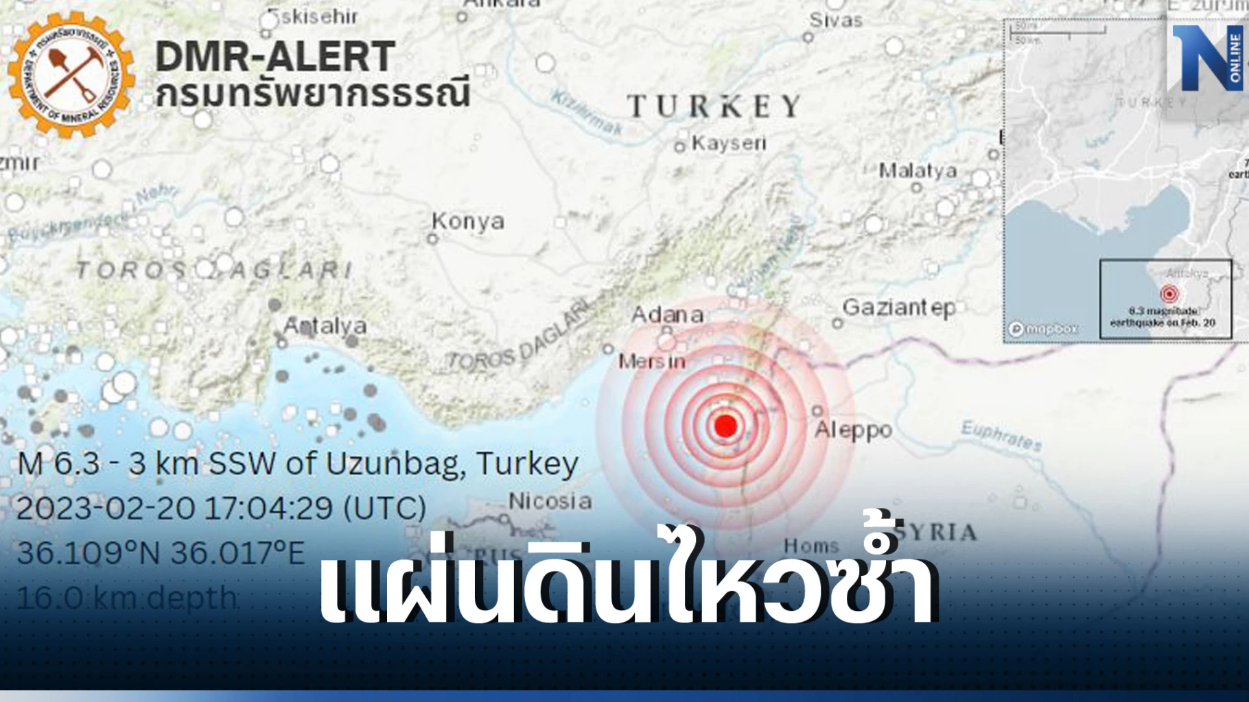 21 กุมภาพันธ์ 2566 ศูนย์ปฏิบัติการธรณีพิบัติภัย กรมทรัพยากรธรณี รายงานสถานการณ์แผ่นดินไหว ระบุว่า เมื่อเวลา 00.04 น. ตามเวลาประเทศไทย เกิดแผ่นดินไหวบนบกขนาด 6.3 ที่ระดับความลึก 16 กม. บริเวณใกล้กับเมือง Uzunbag ในจังหวัด Hatay ทางตอนใต้ของประเทศตุรเคีย ใกล้พรมแดนประเทศซีเรีย