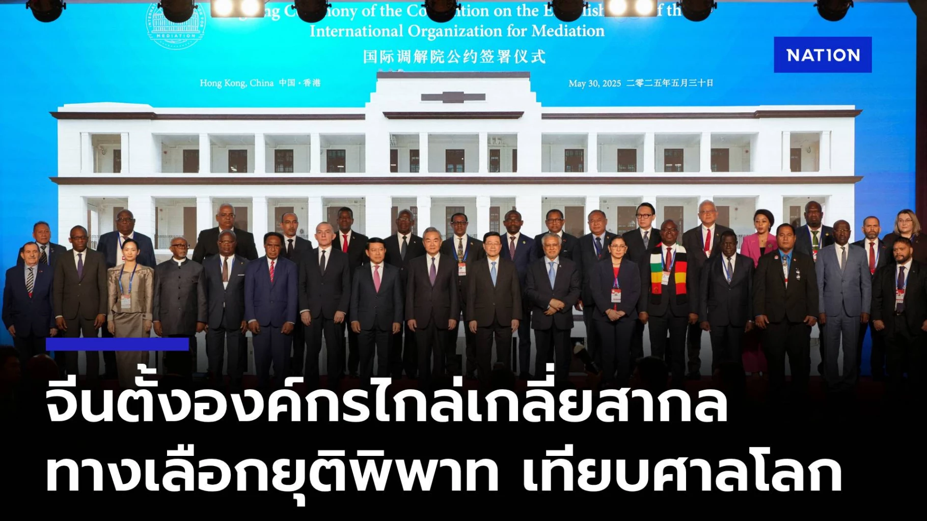 จีนจัดพิธีลงนามในอนุสัญญาจัดตั้งองค์กรระหว่างประเทศเพื่อการไกล่เกลี่ย International Organisation for Mediation (IOMed) โดยมีหวัง อี้ รัฐมนตรีต่างประเทศของจีนเป็นประธานในพิธีที่จัดขึ้นในฮ่องกงในวันศุกร์ (30 พฤษภาคม) โดยมีผู้แทนจากบางประเทศ เช่น อินโดนีเซีย, ปากีสถาน, ลาว, กัมพูชา และเซอร์เบีย รวมถึงผู้แทนจากองค์กรระหว่างประเทศ 20 แห่ง ซึ่งรวมถึง สหประชาชาติ เข้าร่วมด้วย