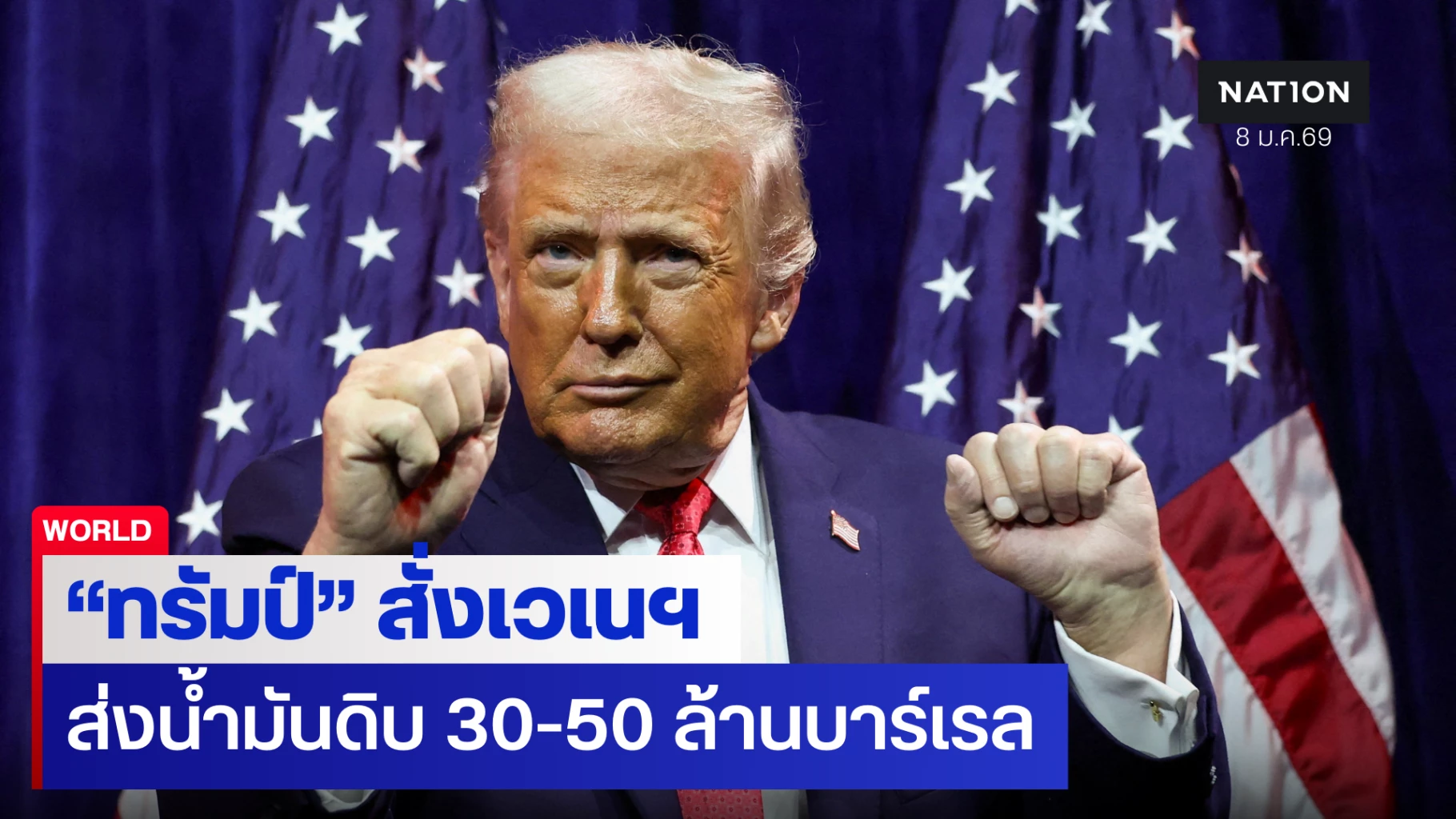 8 มกราคม 2569 ประธานาธิบดีโดนัลด์ ทรัมป์ ของสหรัฐฯ โพสต์บนแพลตฟอร์มโซเชียลมีเดีย "ทรู้ธ โซเชียล" (Truth Social) ของเขาว่า "เวเนซุเอลา" จะต้องส่งมอบน้ำมันดิบจำนวน 30-50 ล้านบาร์เรล ให้แก่สหรัฐฯ เพื่อจำหน่ายในราคาตลาด และรายได้จะอยู่ภายใต้การควบคุมของสหรัฐฯ