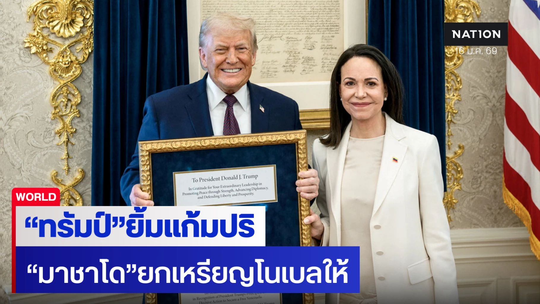 เมื่อวันพฤหัสบดีที่ 15 มกราคม 2569 เกิดเหตุการณ์ประวัติศาสตร์ที่ทำเนียบขาว เมื่อ มาเรีย คอรีนา มาชาโด ผู้นำฝ่ายค้านคนสำคัญของเวเนซุเอลา ได้มอบเหรียญรางวัลโนเบลสาขาสันติภาพที่เธอเพิ่งได้รับเมื่อเดือนก่อนให้แก่ประธานาธิบดี โดนัลด์ ทรัมป์ ระหว่างการพบปะหารือกันเป็นครั้งแรก ซึ่งใช้เวลากว่า 1 ชั่วโมง