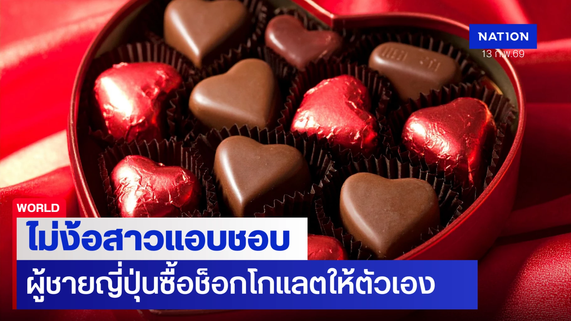 13 กุมภาพันธ์ 2569 ทุกเทศกาล "Valentine’s Day" ซึ่งตรงกับวันที่ 14 กุมภาพันธ์ของทุกปี ที่ญี่ปุ่นจะมีธรรมเนียมการมอบช็อกโกแลตวาเลนไทน์ให้ผู้ชายที่ชอบหรือแอบชอบ ที่เรียกว่า "Honmei Choco" หรือ "ช็อกโกแลตบอกรัก" เพราะมักจะเป็นช็อกโกแลตที่ฝ่ายหญิงมอบให้กับชายหนุ่มคนสำคัญ หรือ แอบชอบ แต่ทุกๆปี ก็ไม่ได้หมายความว่า ผู้ชายทุกคนจะได้รับมอบช็อกโกแลตจากหญิงสาว ทำให้ปีนี้ เกิดปรากฏการณ์แหวกธรรมเนียม เมื่อฝ่ายชายไม่รอให้ใครมามอบให้ และหันไปซื้อให้ตัวเองกันแล้ว