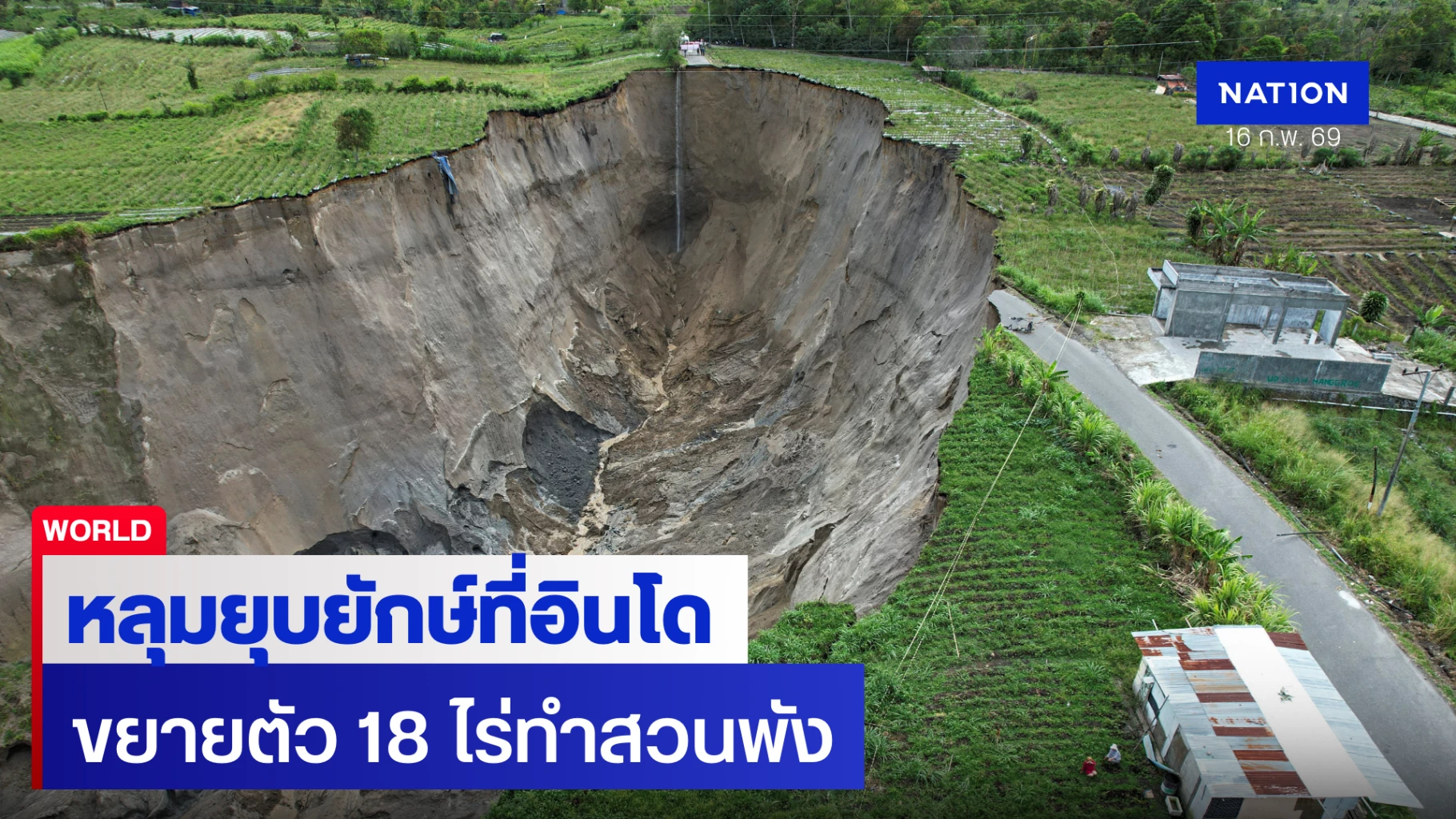 หลุมยุบขนาดใหญ่ในจังหวัดอาเจะห์ อินโดนีเซีย ขยายตัวกว้างกว่า 18 ไร่ กัดกินพื้นที่สวนพริกและไร่กาแฟเสียหายยับเยิน หลังเผชิญน้ำท่วมใหญ่ปลายปี 2568 ทำดินทรุดตัวรวดเร็วที่สุดในรอบ 13 ปี เกษตรกรโอดไร้ที่ทำกินวอนรัฐเร่งชดเชย