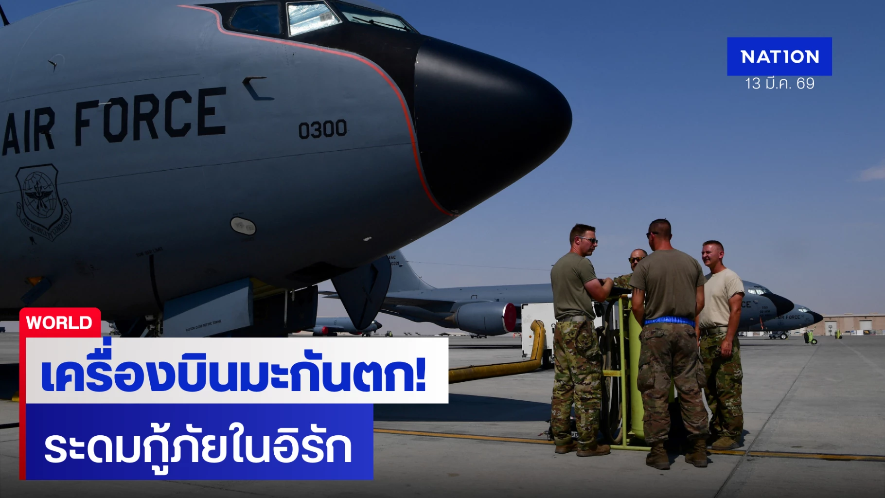 สำนักข่าวเอพี (AP) รายงานความเคลื่อนไหวล่าสุด เมื่อวันศุกร์ที่ 13 มีนาคม 2569 กองทัพสหรัฐฯ ออกแถลงการณ์ด่วนระบุว่า เครื่องบินเติมน้ำมัน (Refueling Aircraft) ของกองทัพได้ประสบอุบัติเหตุตกในพื้นที่ประเทศอิรัก ขณะนี้หน่วยกู้ภัยและทีมค้นหากำลังเร่งระดมกำลังลงพื้นที่เพื่อช่วยเหลือผู้ที่อาจรอดชีวิตอย่างเร่งด่วน