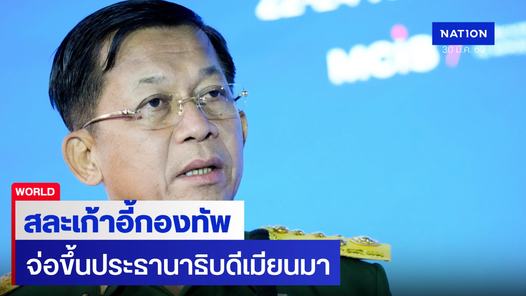 สำนักข่าวรอยเตอร์รายงานเมื่อวันจันทร์ที่ 30 มีนาคม 2569 ว่า พล.อ.อาวุโส มิน อ่อง หล่าย ผู้นำสูงสุดของเมียนมา ได้ตัดสินใจก้าวลงจากตำแหน่งผู้บัญชาการทหารสูงสุดที่ครองมานานกว่า 15 ปี เพื่อเข้าสู่กระบวนการเสนอชื่อเป็นประธานาธิบดีอย่างเป็นทางการ ซึ่งถือเป็นยุทธศาสตร์สุดท้ายในการรักษาอำนาจภายใต้หน้าฉาก "รัฐบาลพลเรือน" หลังจากนำทัพรัฐประหารโค่นล้มรัฐบาลประชาธิปไตยของ ออง ซาน ซูจี เมื่อ 5 ปีก่อน