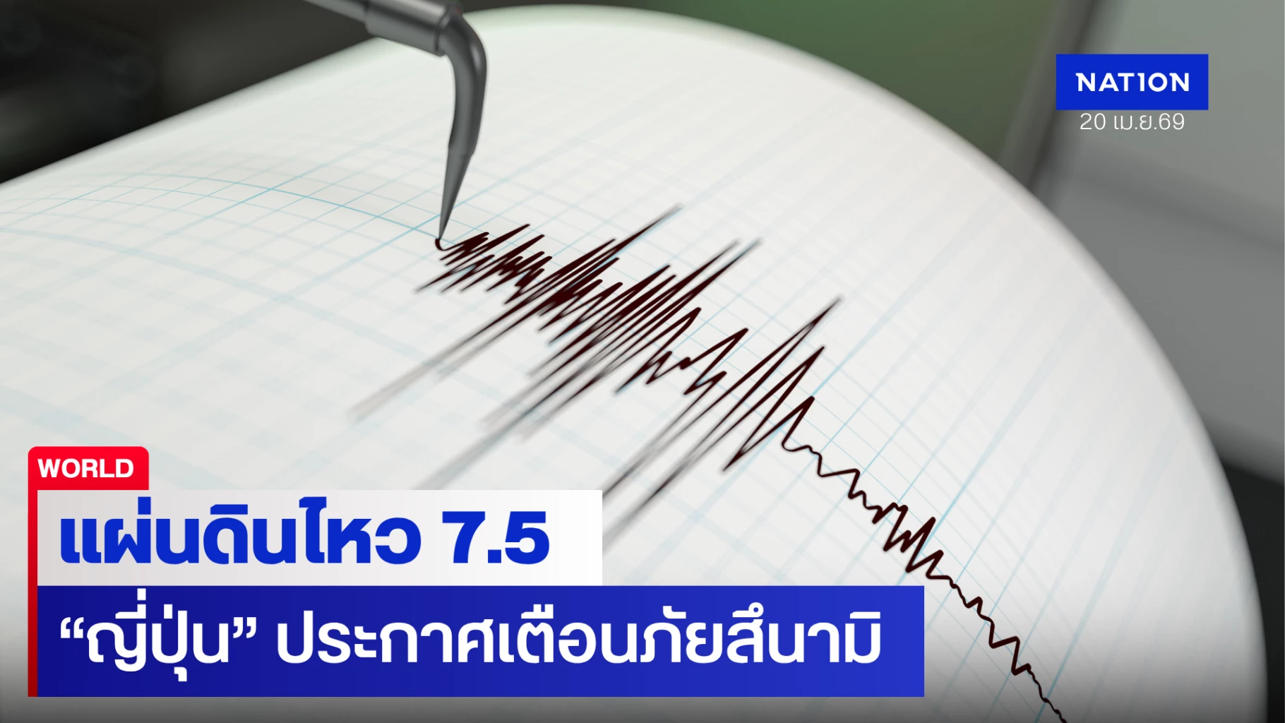 20 เมษายน 2569 เวลาประมาณ 16.53 น. ตามเวลาท้องถิ่นประเทศญี่ปุ่น เกิดเหตุแผ่นดินไหวรุนแรงขนาด 7.5 แมกนิจูด บริเวณนอกชายฝั่ง จ.มิยางิ มีการเตือนสึนามิด้วย ขอให้ประชาชนที่อาศัยอยู่ในพื้นที่ชายฝั่งเร่งอพยพ