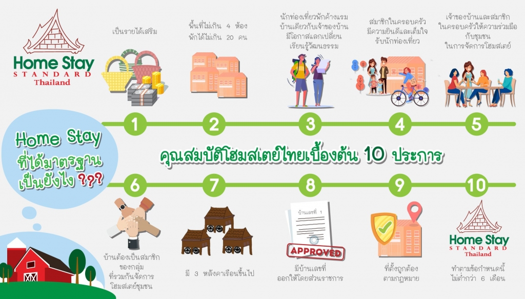 โดยคำนึงถึงคุณภาพการท่องเที่ยวไทย ซึ่งแนวทางในการพัฒนาที่สำคัญ คือ การจัดทำมาตรฐานการท่องเที่ยวไทย นำไปสู่การตรวจประเมินและรับรองมาตรฐานการท่องเที่ยวไทย หนึ่งในมาตรฐานที่กรมการท่องเที่ยวจัดทำขึ้นเพื่อ และพัฒนายกระดับที่พักเพื่อการท่องเที่ยวในชุมชน คือ มาตรฐานที่พักสัมผัสวัฒนธรรมชนบท หรือที่เรียกว่า มาตรฐานโฮมสเตย์ไทย (Homestay)เกณฑ์มาตรฐานและกระบวนการตรวจประเมินดังกล่าวสร้างความเชื่อมั่นได้ว่าโฮมสเตย์ที่ได้รับการรับรองมาตรฐานนี้ มีคุณภาพได้มาตรฐาน สะอาด ปลอดภัย เป็นธรรม และรักษ์สิ่งแวดล้อม
