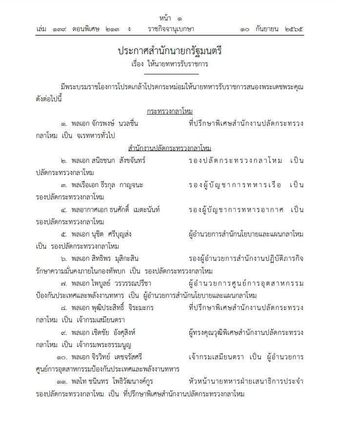 เมื่อวันที่ 10 ก.ย.65 "ราชกิจจาฯ" ได้เผยแพร่ ประกาศสํานักนายกรัฐมนตรี เรื่อง "แต่งตั้งนายทหารชั้นนายพล" โดย พล.อ.ประวิตร วงษ์สุวรรณ รองนายกรัฐมนตรี ปฏิบัติราชการรักษาการนายกฯ ลงนามรับสนองพระบรมราชโองการฯ แต่งตั้งโยกย้าย"นายทหารชั้นนายพล" จำนวน 765 นาย พร้อมกันนั้น ยังได้มี ประกาศสำนักนายกรัฐมนตรี เรื่อง"พระราชทานยศทหารชั้นนายพล" จำนวน 530 ราย มีผลตั้งแต่ วันที่ 1 ต.ค. 2565 เป็นต้นไป โดยมีตำแหน่งที่น่าสนใจ ดังนี้