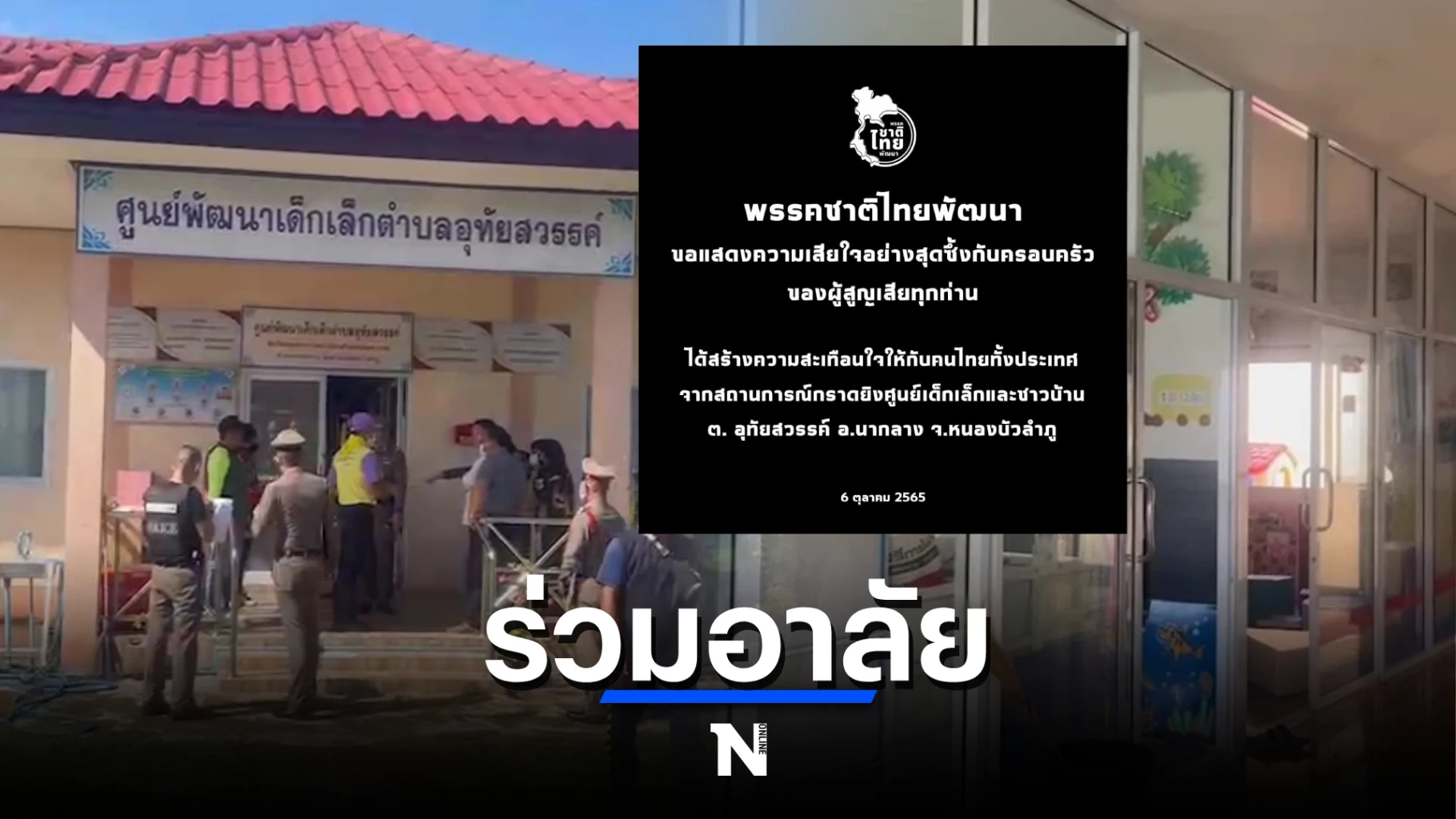 6 ตุลาคม 2565 ผู้สื่อข่าวรายงานว่า จากเหตุการณ์กราดยิงภายในศูนย์พัฒนาเด็กเล็ก อบต.อุทัยสวรรค์ อ.นากลาง จ.หนองบัวลำภู จนทำให้มีผู้เสียชีวิตและบาดเจ็บจำนวนมาก