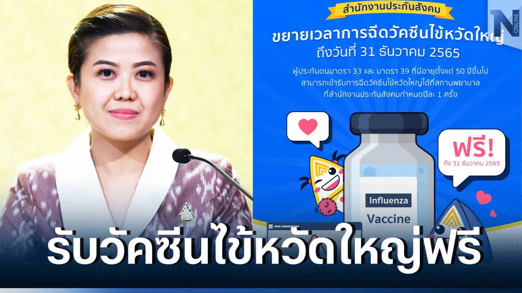 โดยสำนักงานประกันสังคม ได้ขยายระยะเวลาในรับบริการฉีดวัคซีนไข้หวัดใหญ่ฟรี โดยไม่มีค่าใช้จ่าย ให้แก่ผู้ประกันตนมาตรา 33 และ ผู้ประกันตนมาตรา 39 ที่มีอายุตั้งแต่ 50 ปีขึ้นไป ตามสิทธิปีละ 1 ครั้ง