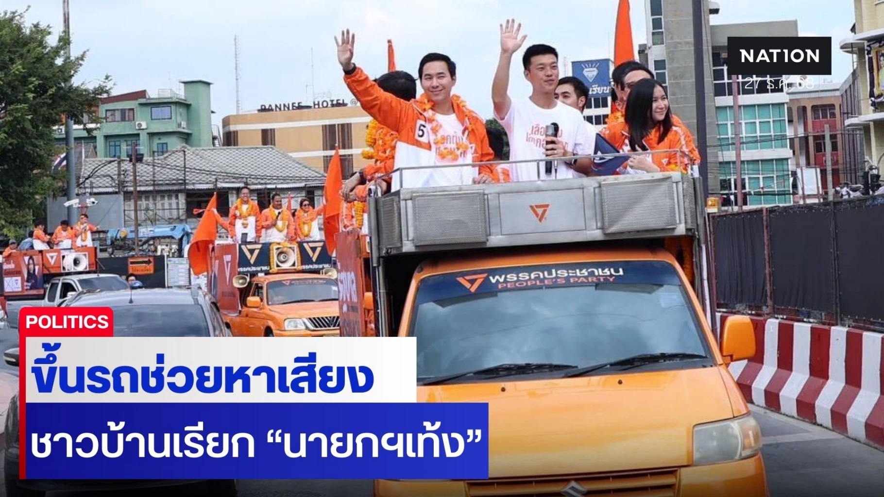ซึ่งประชาชนได้โบกมือทักทาย และบางคนตะโกนเรียก "นายกฯเท้ง "