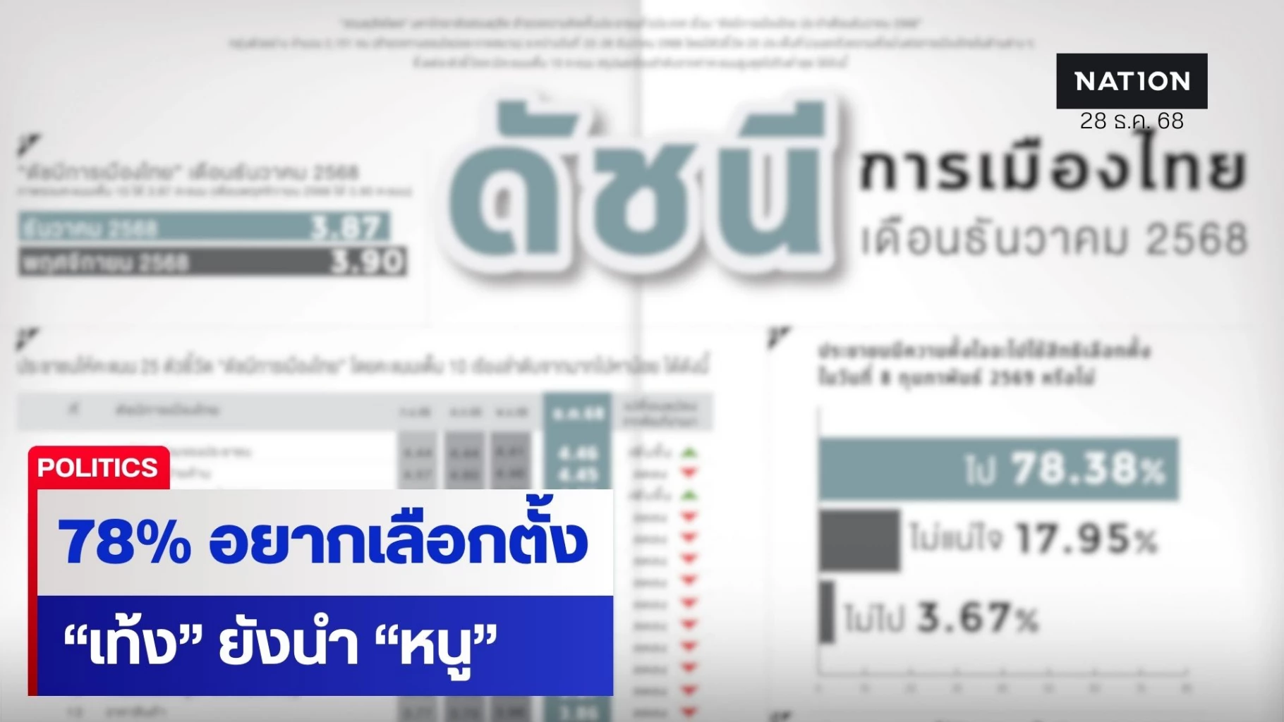 28 ธันวาคม 2568 สวนดุสิตโพล เปิดผลสำรวจ : “ดัชนีการเมืองไทย เดือนธันวาคม 2568” กลุ่มตัวอย่าง จำนวน 2,151 คน (สำรวจทางออนไลน์และภาคสนาม) ระหว่างวันที่ 22-26 ธันวาคม 2568 พบว่า กลุ่มตัวอย่างให้คะแนนภาพรวมดัชนีการเมืองไทยประจำเดือนธันวาคม 2568 เฉลี่ย 3.87 คะแนน ลดลงจากเดือน พฤศจิกายน 2568 ที่ได้ 3.90 คะแนน