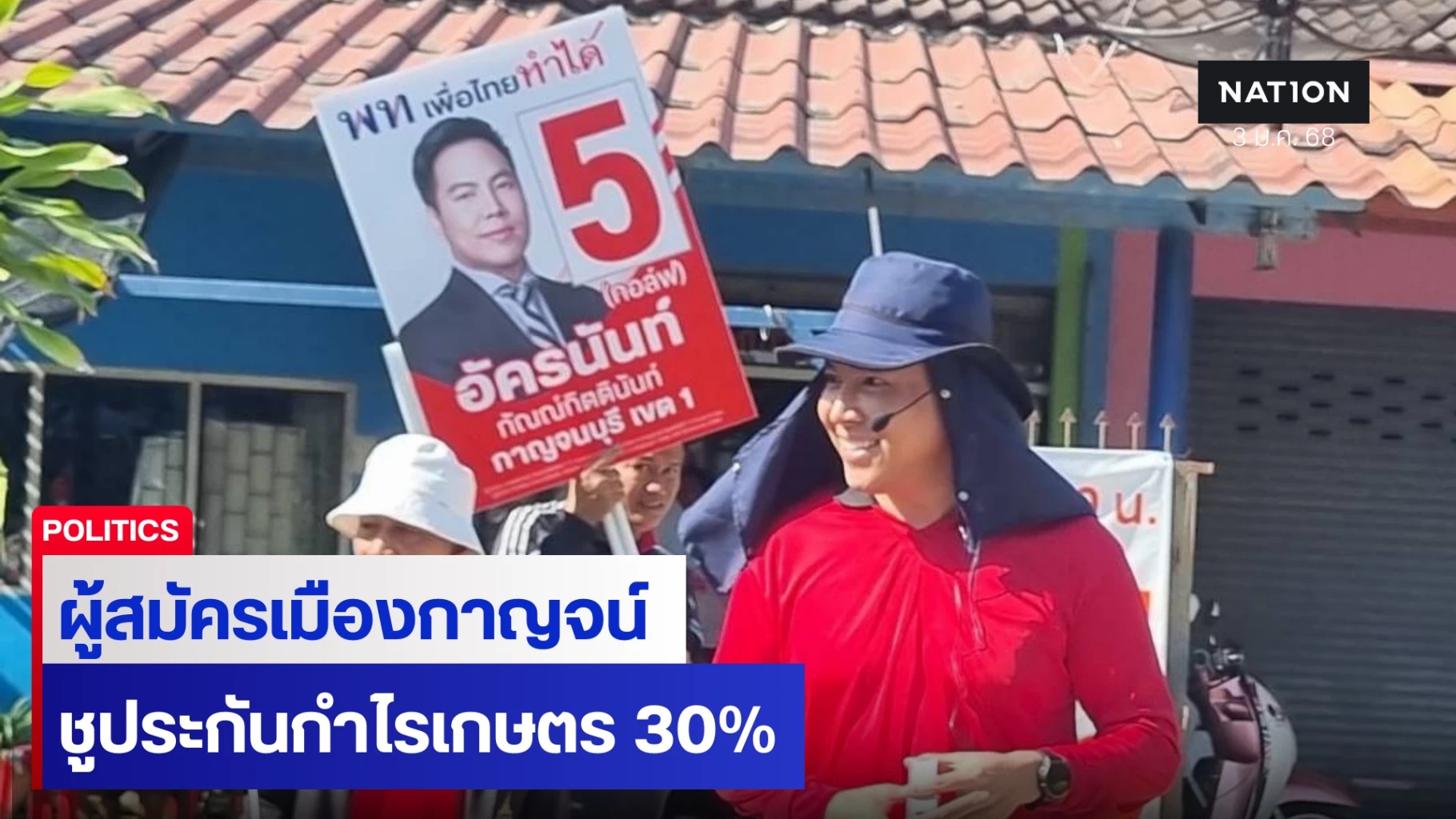 นายอัครนันท์ กัณณ์กิตตินันท์ ผู้สมัคร สส.กาญจนบุรี เขต 1 เบอร์ 5 พรรคเพื่อไทย ตลอดทั้งวันลงพื้นที่หาเสียง ที่ตำบลหนองหญ้า อำเภอเมือง กาญจนบุรี นั่งมอเตอร์ไซต์พ่วงข้าง เดินเท้าเคาะประตูบ้าน พบพี่น้องประชาชน พร้อมกับชูนโยบายของพรรค เช่นการประกันกำไรสินค้าเกษตร 30% เกษตรกรต้องไม่แบกรับความผันผวนของราคาสินค้าเกษตร หวยเกษียน บ้านเพื่อคนไทย ค่าไฟไม่เกิน 3.70 บาท/หน่วย และแก้ปัญหาสแกมเมอร์