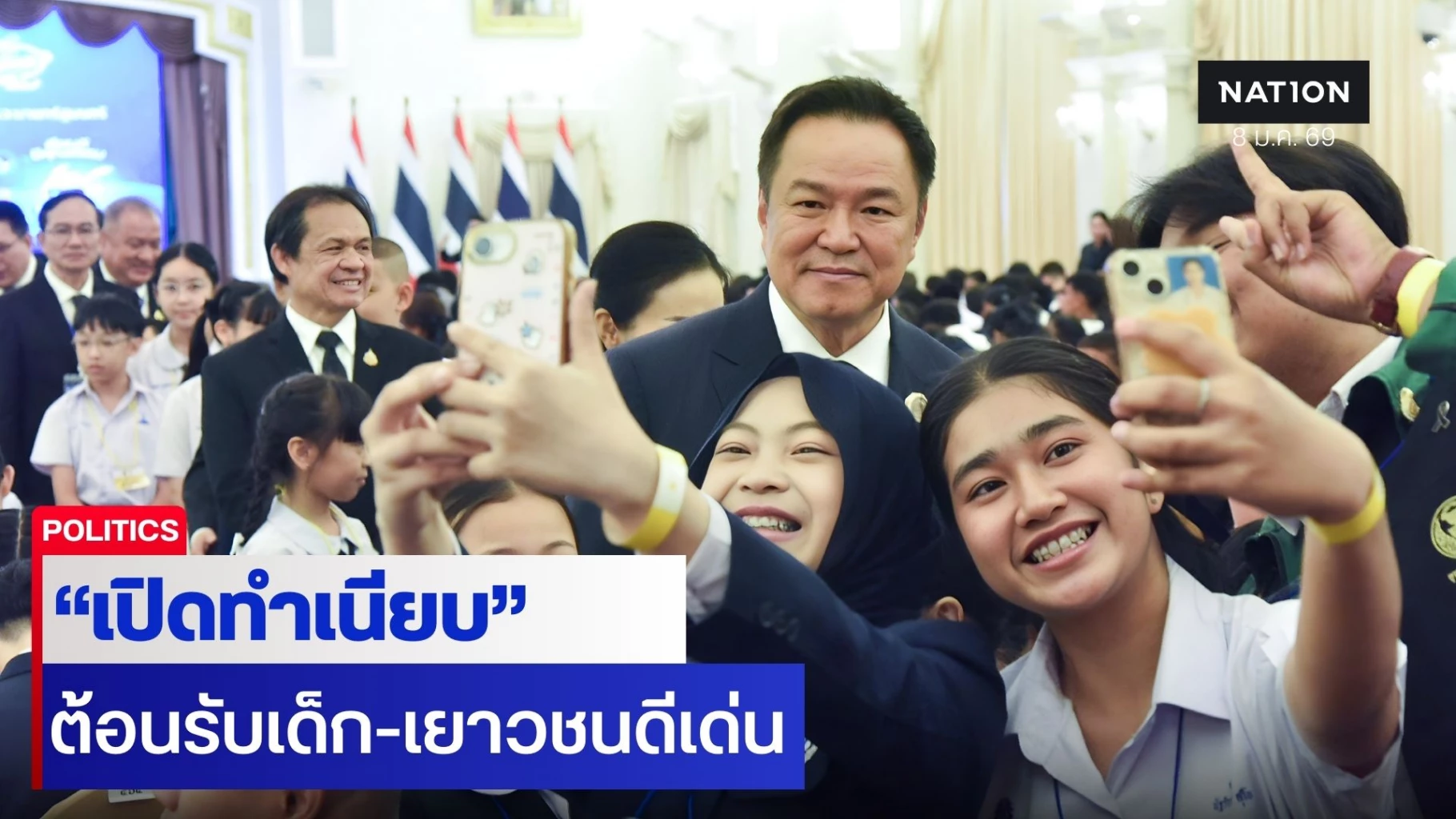 นายอนุทิน กล่าวต่อว่า การที่ทุกคนได้มาอยู่ในที่แห่งนี้ ขอให้ถือเป็นแรงบันดาลใจเผื่อจะได้ตั้งเข็ม ให้เกิดความมุ่งมั่น และพยายามที่จะทำในสิ่งที่เกิดประโยชน์ กับบ้านเมืองให้มากที่สุดในอนาคต และตนเองที่ตอนนี้ถือเป็นเด็กโข่งแล้ว เป็นผู้ที่ผ่านชีวิต แต่ก็ยังจำวันชื่นคืนสุขในตอนที่ยังเป็นเยาวชนได้ไม่รู้ลืม ถือเป็นช่วงชีวิตที่มีความสุขที่สุด มีทั้งโอกาสและทำให้เราได้ทดลองว่าชีวิตจะเดินหน้าไปทางไหน ลูกหลานที่อายุขนาดนี้เป็นนักเรียนนักศึกษา เรายังสามารถที่จะลองผิดลองถูกได้ ตรงไหนผิดก็จำเป็นบทเรียน ส่วนตรงไหนถูกก็ทำให้ถูกมากยิ่งขึ้น และมีประสิทธิภาพมากยิ่งขึ้น ยังมีเวลาได้แก้ไขปัญหา เมื่อมาถึงวัยอย่างลุงแบบนี้ ต้องทำให้ถูกต้องเท่านั้น เมื่อผิดแล้วไม่มีเวลาเหลือให้ไปแก้ไข การมาอยู่ในทำเนียบรัฐบาลอยากให้ทุกคนได้ซึมซับและตั้งมั่นว่าเราต้องมีความเป็นเลิศในด้านวิชาการ กีฬา ศิลปวัฒนธรรม รวมถึงความสามารถด้านอื่นๆ และควบคู่ไปกับคุณธรรมและความรับผิดชอบต่อสังคม และหวังว่าในวันเสาร์ 11 ม.ค. 69 ที่ตรงกับวันเด็กแห่งชาติ หลายคนจะได้มีโอกาสไปในสถานที่ราชการ การรวมถึงสถานที่ด้านความมั่นคงเพื่อดูยุทโธปกรณ์ อาวุธ ดูเรื่องความรู้เทคโนโลยี ด้านการพัฒนาสังคมต่างๆ ซึ่งล้วนแล้วแต่จะทำให้เกิดแรงบันดาลใจ