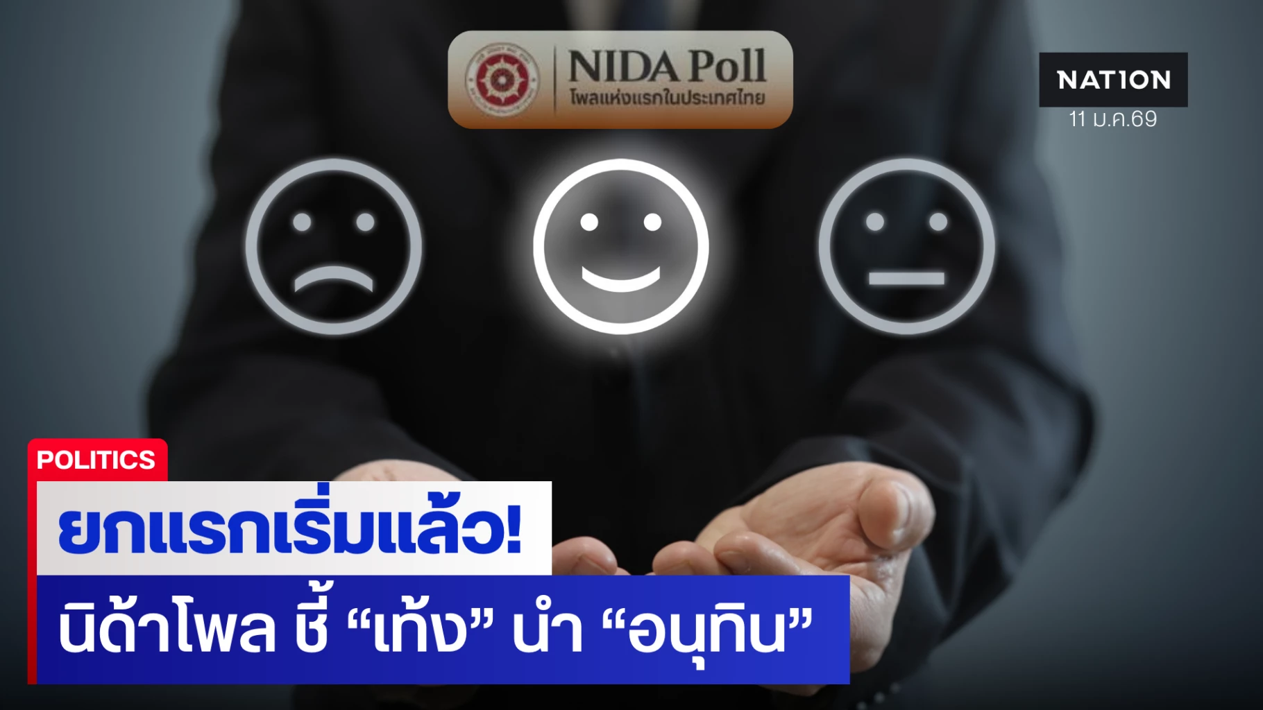 11 มกราคม 2569 ศูนย์สำรวจความคิดเห็น “นิด้าโพล” สถาบันบัณฑิตพัฒนบริหารศาสตร์ (นิด้า) เปิดเผยผลการสำรวจ เรื่อง “ยกแรก กระแสเลือกตั้ง 69” ทำการสำรวจระหว่างวันที่ 5-8 มกราคม 2569 จากประชาชนที่มีอายุ 18 ปีขึ้นไป กระจายทุกภูมิภาค ระดับการศึกษา อาชีพ และรายได้ ทั่วประเทศ รวมจำนวนทั้งสิ้น 2,500 หน่วยตัวอย่าง เกี่ยวกับกระแสการเลือกตั้ง ปี 2569 การสำรวจอาศัยการสุ่มตัวอย่างโดยใช้ความน่าจะเป็นจากบัญชีรายชื่อฐานข้อมูลตัวอย่างหลัก (Master Sample) ของ “นิด้าโพล” สุ่มตัวอย่างแบบหลายขั้นตอน (Multi-stage Sampling) เก็บข้อมูลด้วยวิธีการสัมภาษณ์ทางโทรศัพท์ โดยกำหนดค่าความคลาดเคลื่อนไม่เกิน 0.05 ที่ระดับความเชื่อมั่น ร้อยละ 97.0