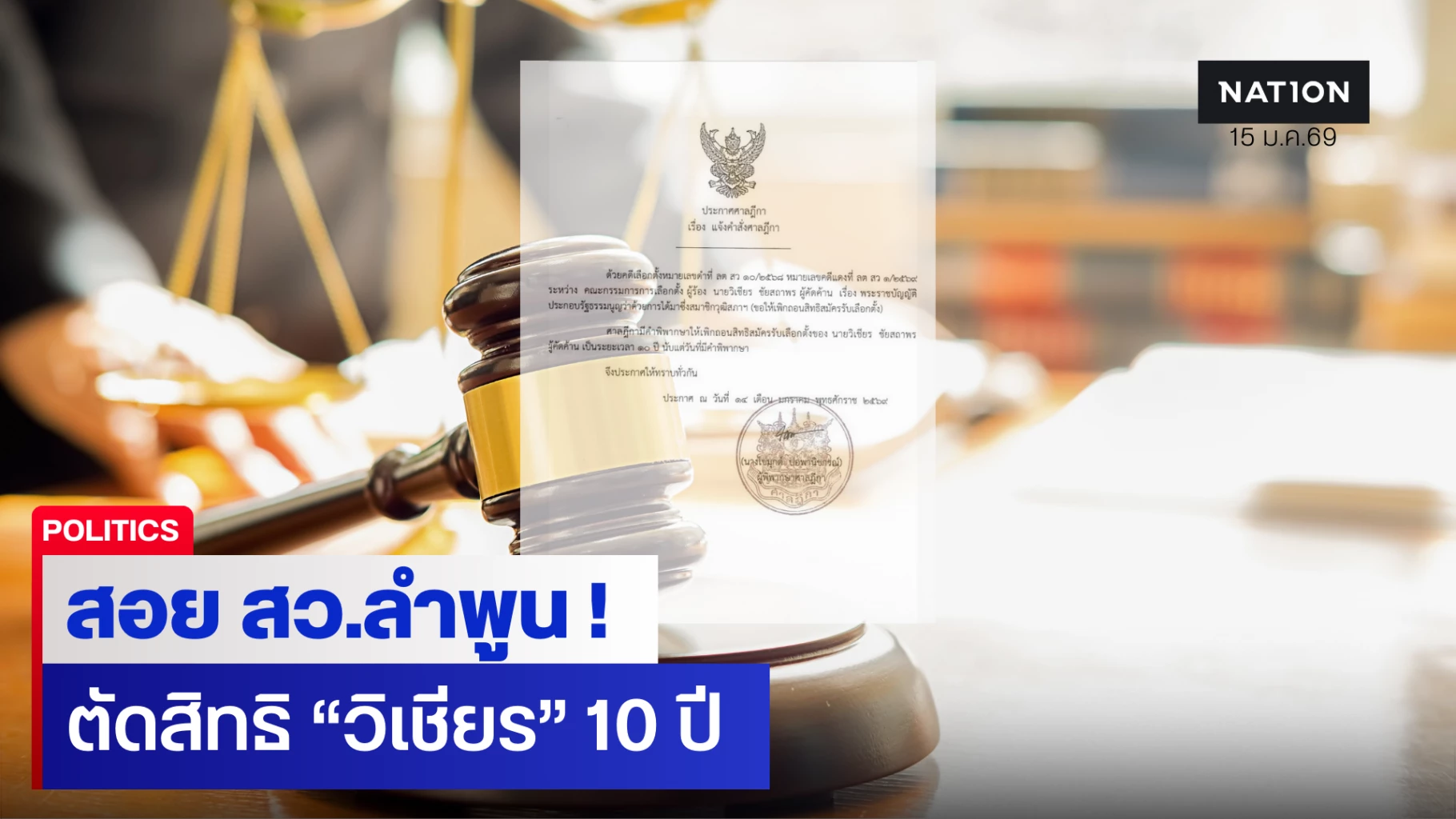 ศาลฎีกามีคำพิพากษาให้เพิกถอนสิทธิสมัครรับเลือกตั้งของ นายวิเชียร ชัยสถาพร ผู้คัดค้าน เป็นเวลา 10 ปี นับแต่วันที่มีคำพิพากษา ประกาศ ณ วันที่ 14 มกราคม 2569