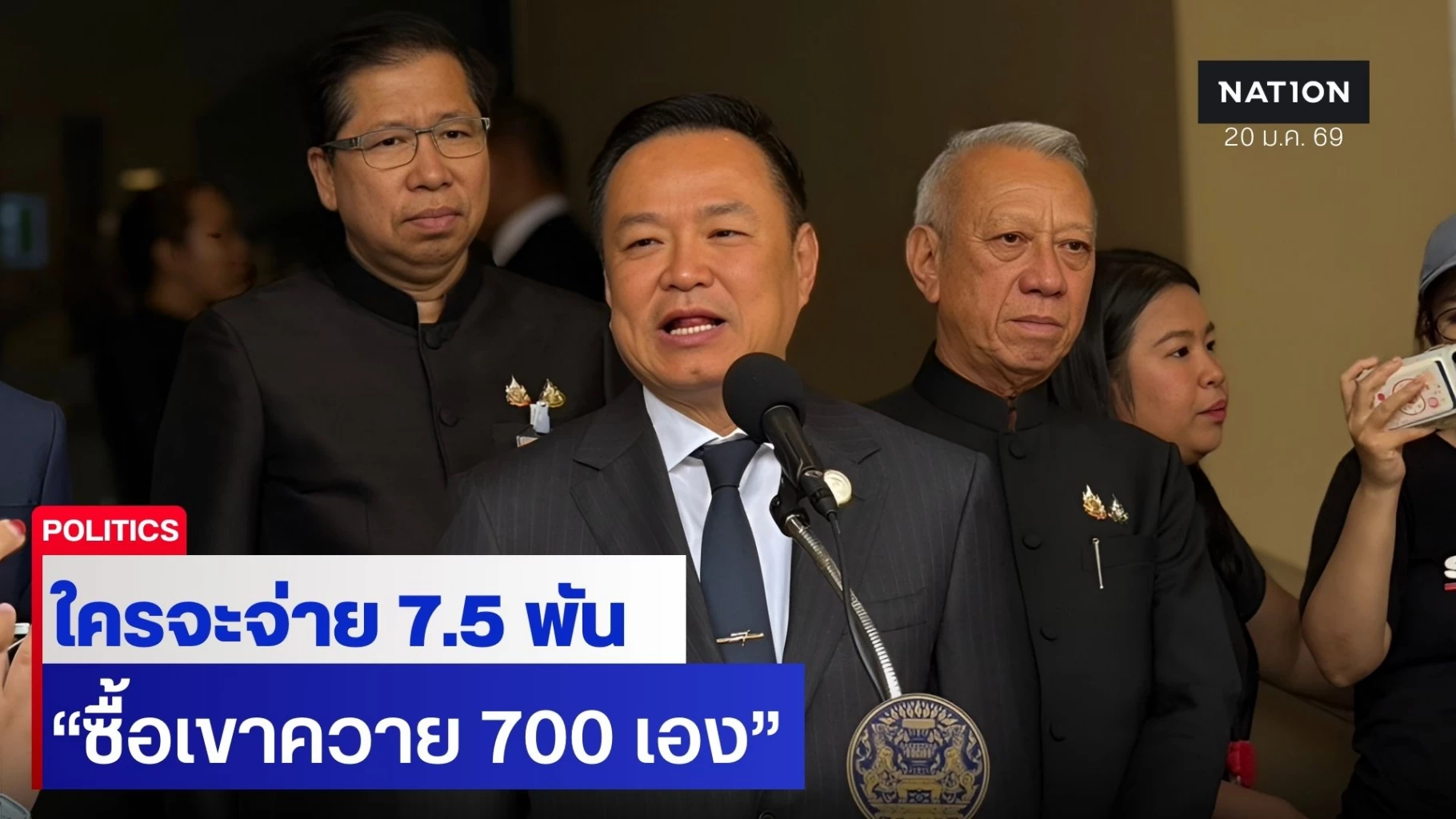 นายอนุทิน ทำหน้าตกใจ ย้อนคำพูดว่า ซื้อเสียง 7,500 บาท ก่อนจะกล่าวว่าซื้อเขาควาย 700 บาทเอง ใครเป็นคนจ่าย 7,500 บาท แจ้งด้วยเดี๋ยวจะซื้อเขาควายครอบให้