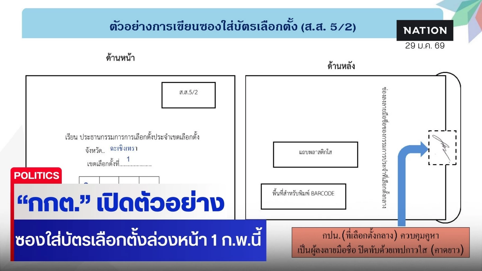 พร้อมเน้นย้ำผู้มีสิทธิเลือกตั้งให้ตรวจสอบข้อมูลที่อยู่บนหน้าซองใส่บัตรเลือกตั้งให้ถูกต้องครบถ้วน ทั้งชื่อจังหวัด เขตเลือกตั้งตั้งและรหัสเลือกตั้ง ซึ่งเป็นตัวเลข 4 หลัก ถ้าข้อมูลไม่ถูกต้องให้แจ้ง กปน.ที่เลือกตั้งกลาง ดำเนินการแก้ไขให้ถูกต้องเพื่อให้ซองที่ใส่บัตรเลือกตั้งสามารถส่งกลับไปยังเขตเลือกตั้งตั้งของผู้มีสิทธิเลือกตั้งได้อย่างถูกต้อง ส่วนการลงคะแนนเลือกตั้ง สส.ล่วงหน้าในเขตเลือกตั้งตั้งจะไม่ได้รับซองใส่บัตรเลือกตั้ง