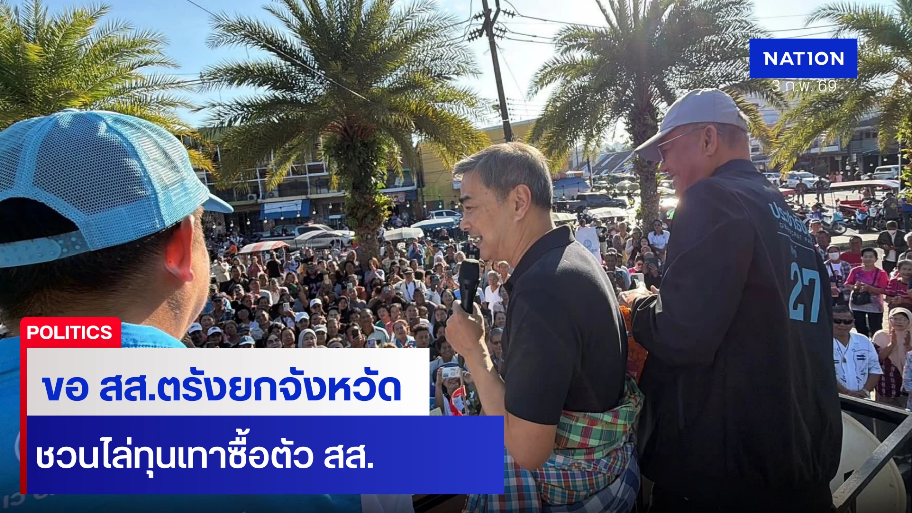 "อภิสิทธิ์" ลุย "ตรัง" หาเสียง-ย้ำคนใต้ใจเดียวขอ ปชป.เหมายกจังหวัด 4 เขตไม่แบ่งใคร ร่วมไล่ทุนเทาซื้อตัว สส.30-70 ล้าน - ชาวบ้านบริจาค 3,000 ช่วย ปชป.หาเสียง