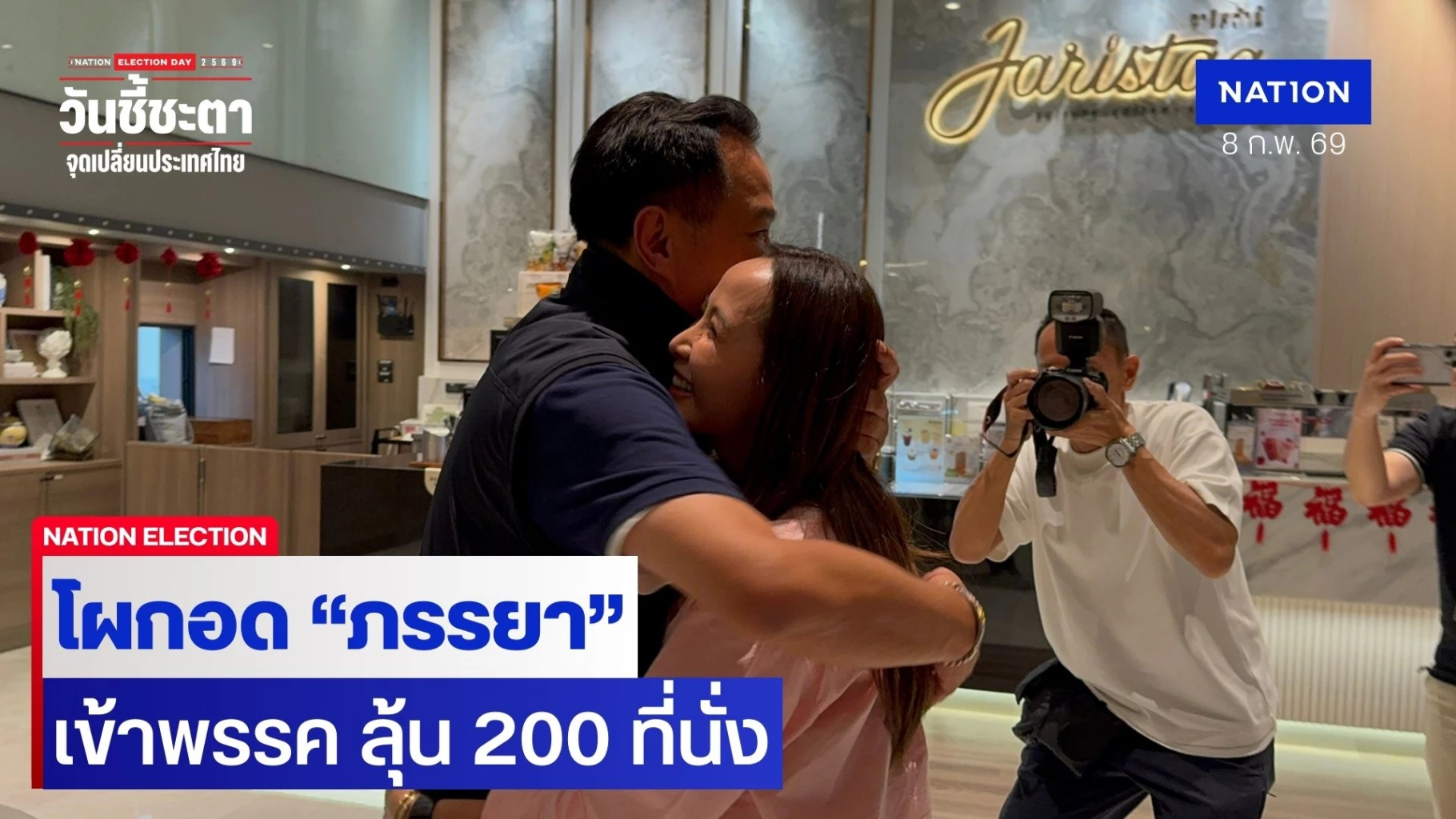 ก่อนจะเดินตรงไปที่ร้านจาริสต้า เพื่อเข้าไปหา น.ส.ธนนนท์ นิรามิษ ภรรยาและวิ่งเข้าไปกอดทันที