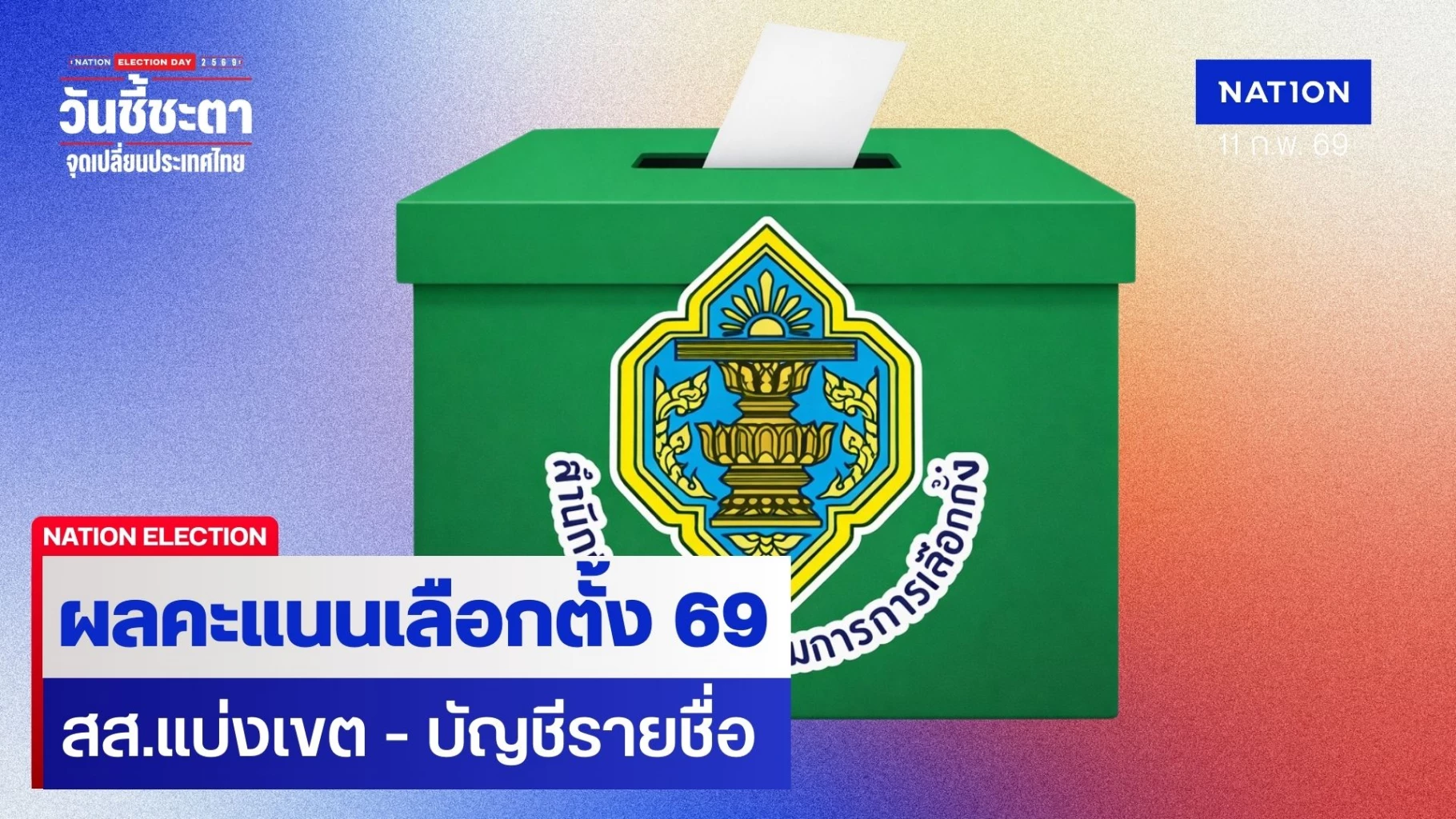 11 กุมภาพันธ์ 2569 เว็บไซต์สำนักงานคณะกรรมการการเลือกตั้ง(กกต.) เผยแพร่ข้อมูลผลการนับคะแนน การเลือกตั้ง2569 ระบุว่า ตามที่ได้มีพระราชกฤษฎีกายุบสภาผู้แทนราษฎร พ.ศ. 2568 และคณะกรรมการการเลือกตั้ง ได้กำหนดให้วันอาทิตย์ที่ 8 กุมภาพันธ์ พ.ศ. 2569 เป็นวันเลือกตั้ง และได้ดำเนินการจัดการเลือกตั้งเสร็จสิ้นแล้วนั้น