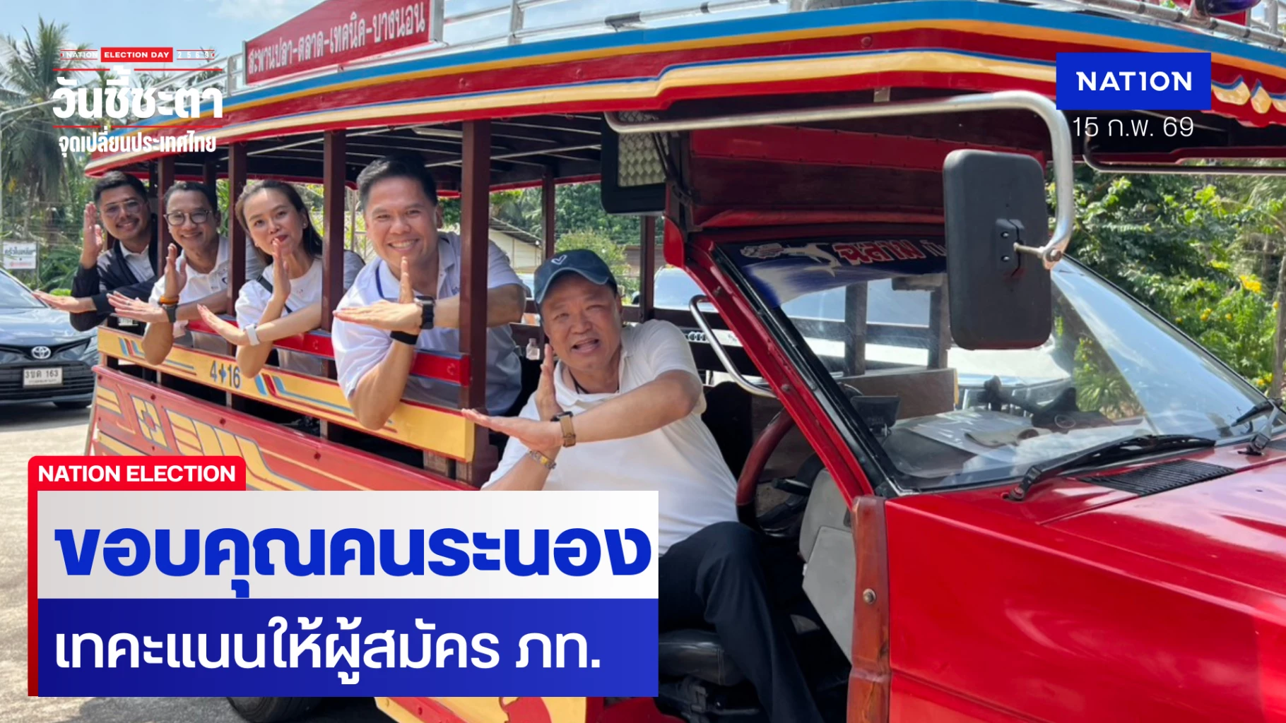 นอกจากนี้ ยังมีภาพของ นายอนุทิน นายวราวุธ นางสาวไตรศุลี และนายคงกฤษ ฉัตรมาลีรัตน์ ว่าที่ สส.ระนอง พรรคภูมิใจไทย นั่งถ่ายรูปกับรถสองแถวไม้แดง โดยทำท่าพลัส ซึ่งเป็นท่าประจำของพรรคภูมิใจไทยด้วย