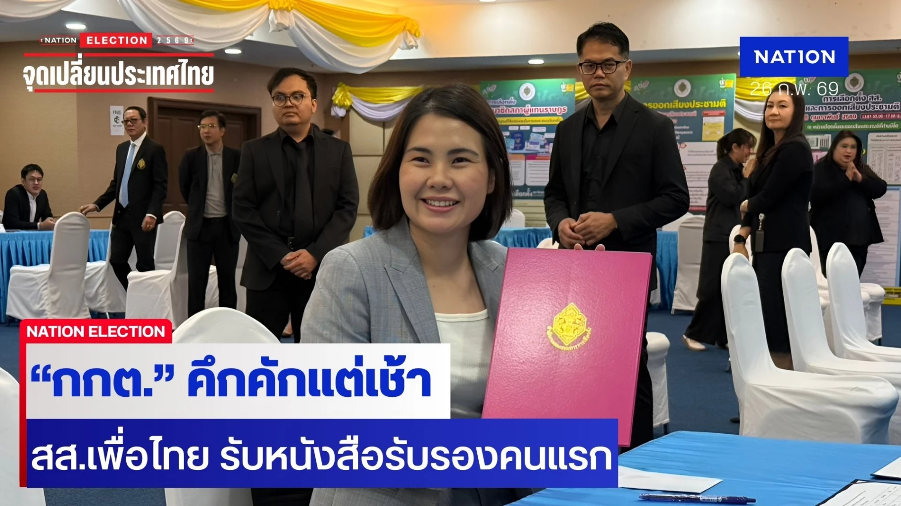 26 กุมภาพันธ์ 2569 ที่สำนักงานคณะกรรมการการเลือกตั้ง (กกต.) บรรยากาศเริ่มคึกคัก มี สส. และผู้แทน ทยอยมารับหนังสือรับรองการได้รับเลือกตั้งเป็นสมาชิกสภาผู้แทนราษฎรแบบแบ่งเขตเลือกตั้ง หลังวานนี้ (25 ก.พ.69) กกต. รับรองไปแล้ว 396 คน อย่างเป็นทางการ