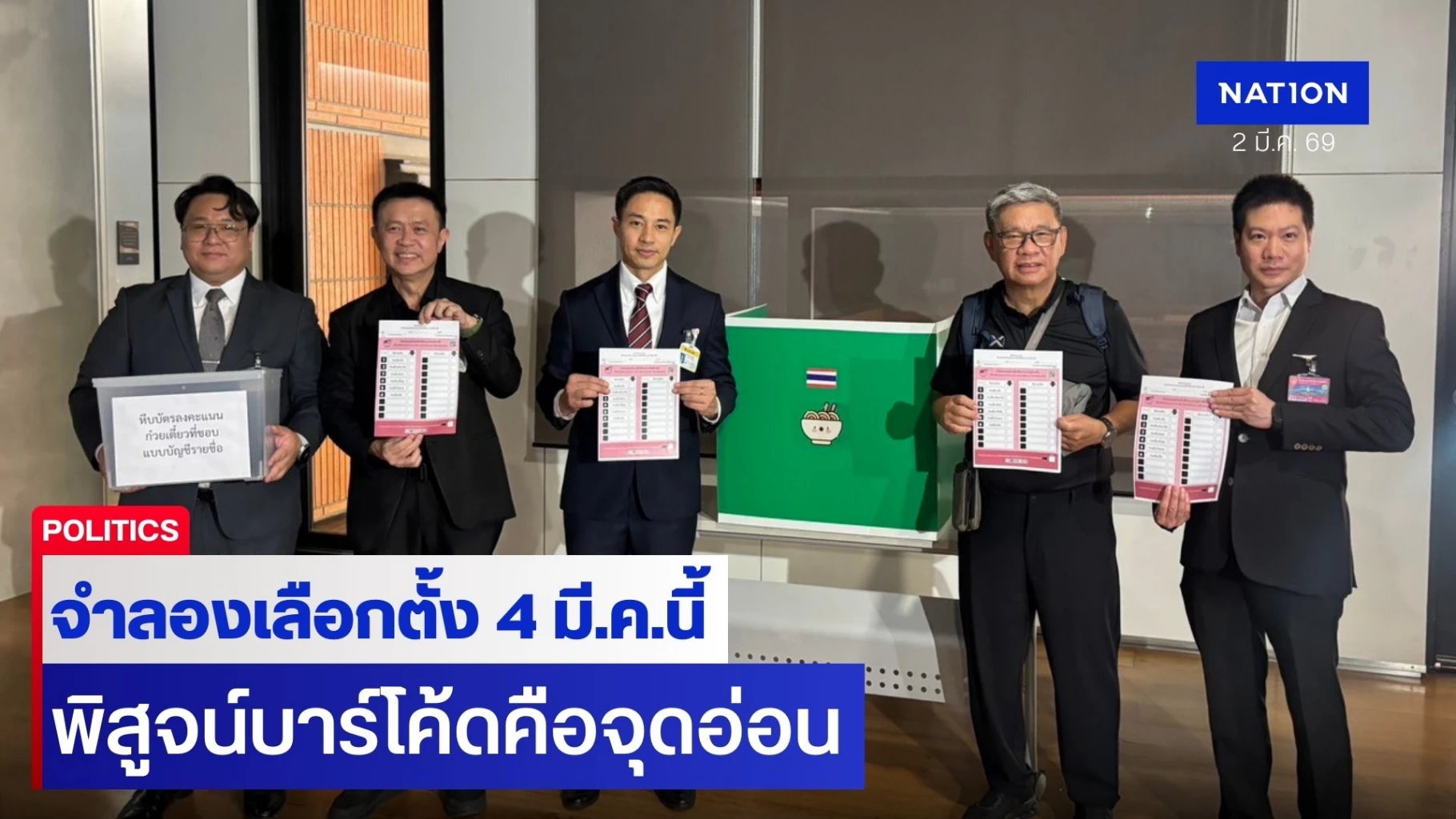 โดย นายนรเศรษฐ์ พร้อมคณะได้นำสื่อมวลชน ไป ดูสถานที่การจำลองการเลือกตั้ง โดยมีการตั้งคูหาและบัตรเลือกตั้งจำลอง ซึ่งมีบาร์โค้ดอยู่บนบัตร และใช้ชื่อของก๋วยเตี๋ยวเป็นตัวเลือกในการกาบัตรเลือกตั้งแบบจำลอง ซึ่งมีทั้งหมด 6 เบอร์
