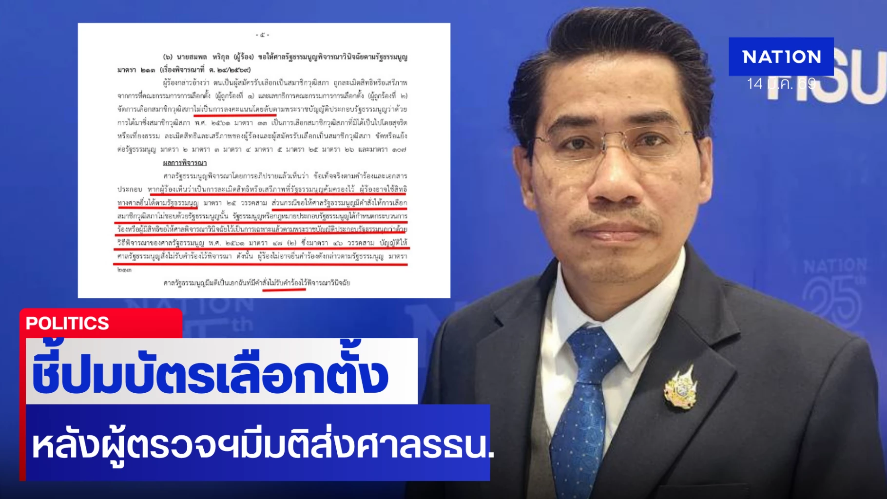 14 มีนาคม 2569 สืบเนื่องจากมติผู้ตรวจการแผ่นดินส่งคำร้องต่อศาลรัฐธรรมนูญปมบัตรเลือกตั้งที่มีบาร์โค้ดและคิวอาร์โค้ด เพื่อวินิจฉัยว่าการเลือกตั้งเป็นโมฆะหรือไม่ ทำให้กระแสการเมืองร้อนฉ่า ส่งผลกระทบต่อการจัดตั้งรัฐบาลชุดใหม่หรือไม่