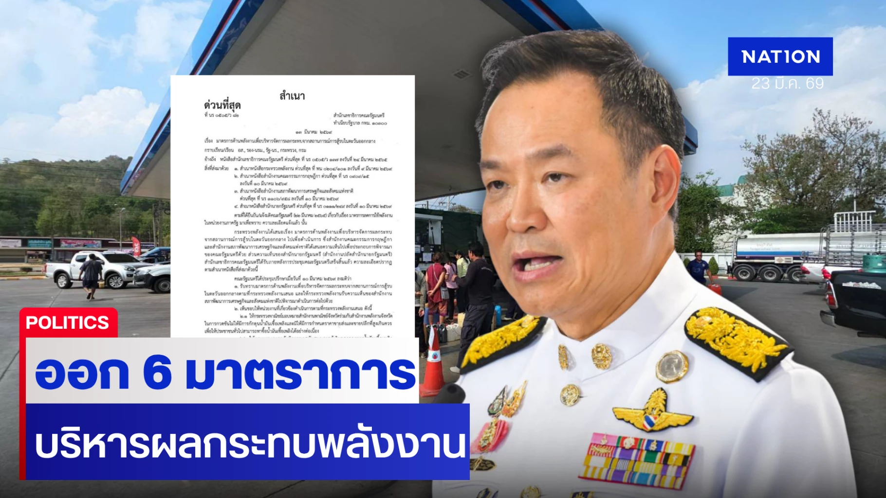 23 มีนาคม 2569 ผู้สื่อข่าวรายงานจากทำเนียบรัฐบาลว่า เมื่อวันที่ 13 มีนาคม 2569 สำนักเลขาธิการคณะรัฐมนตรี ได้ออกหนังสือเวียน องค์กรอิสระตามรัฐธรรมนูญ รองนายกฯ รัฐมนตรี กระทรวง กรม เกี่ยวกับมาตรการด้านพลังงานเพื่อบริหารจัดการ ผลกระทบจากสถานการณ์การสู้รบในตะวันออกกลาง วิกฤตพลังงาน 2569 ระบุว่า