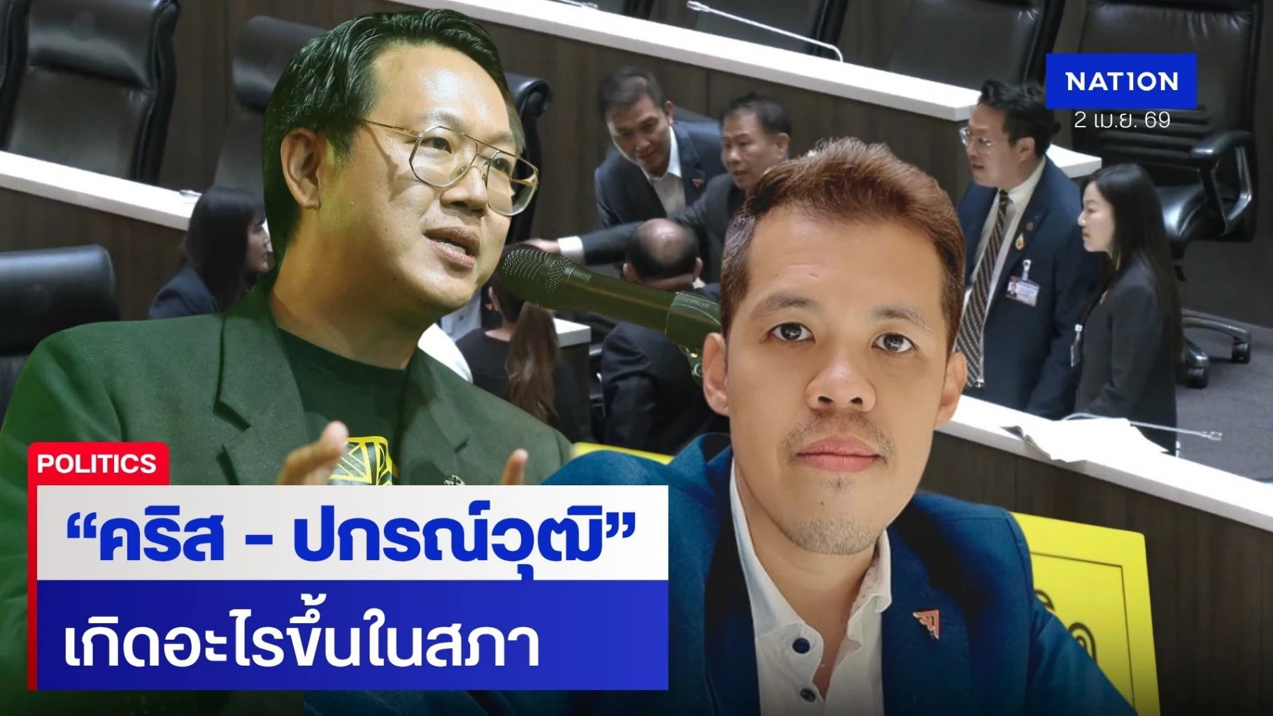 กลายเป็นช็อตเด็ดในสภาผู้ทรงเกียรติ ในการประชุมสภาผู้แทนราษฎร เมื่อ 2 สส. ต่างพรรค นายปกรณ์วุฒิ อุดมพิพัฒน์สกุล สส.บัญชีรายชื่อ พรรคประชาชน (ปชน.) เดินเข้าไปหา นายคริส โปตระนันทน์ สส.บัญชีรายชื่อ พรรคเศรษฐกิจ ในการประชุมสภา วันที่ 2 เมษายน 2569