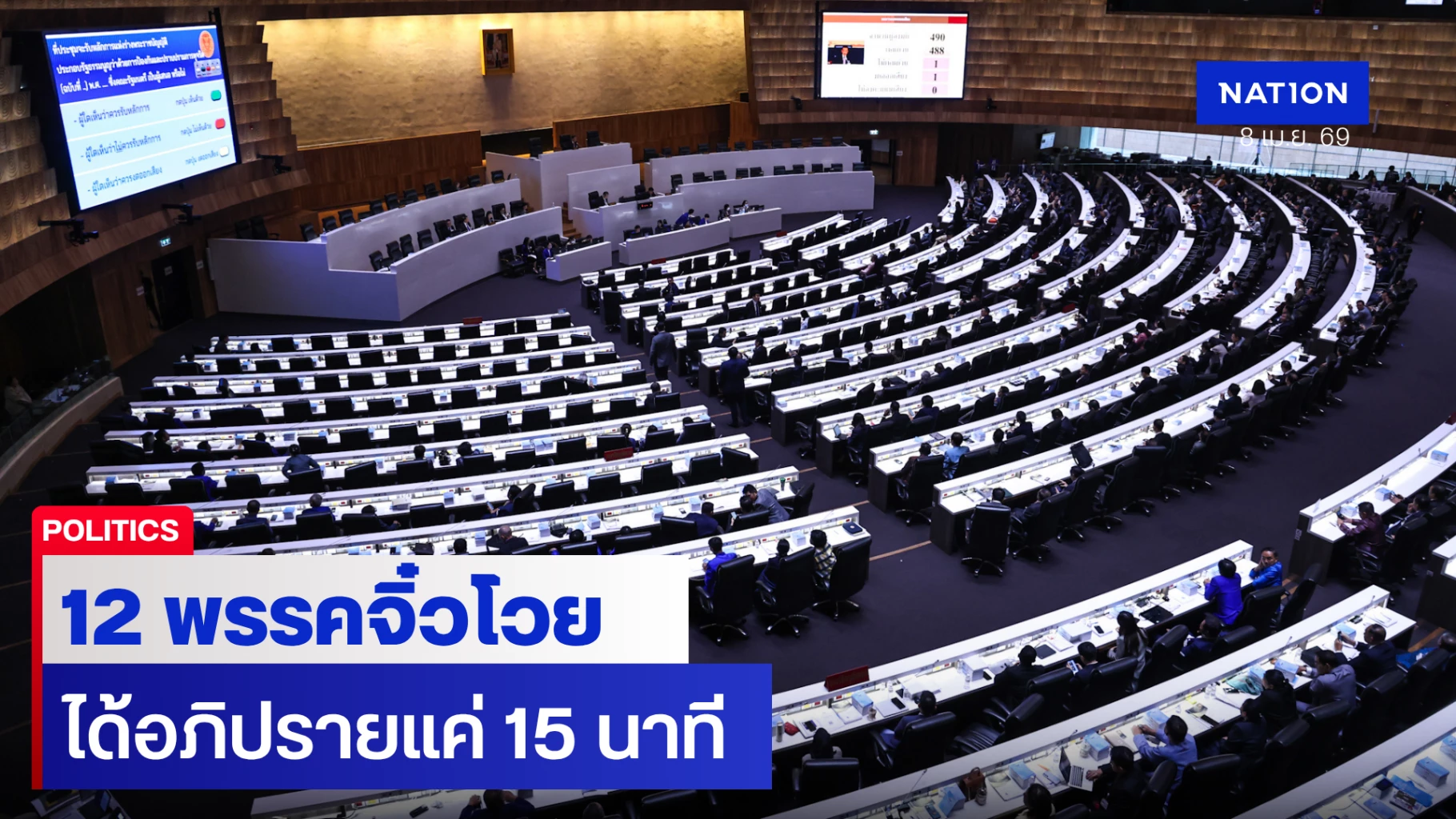 “12 พรรคจิ๋ว” โวยได้ 15 นาที ชำแหละนโยบายรัฐบาล! อึ้งการแบ่งเวลาอภิปรายนโยบายของรัฐบาล 12 พรรคเล็ก หามรัฐบาล 16 เสียง แค่อ้าปากก็หมดเวลาแล้ว