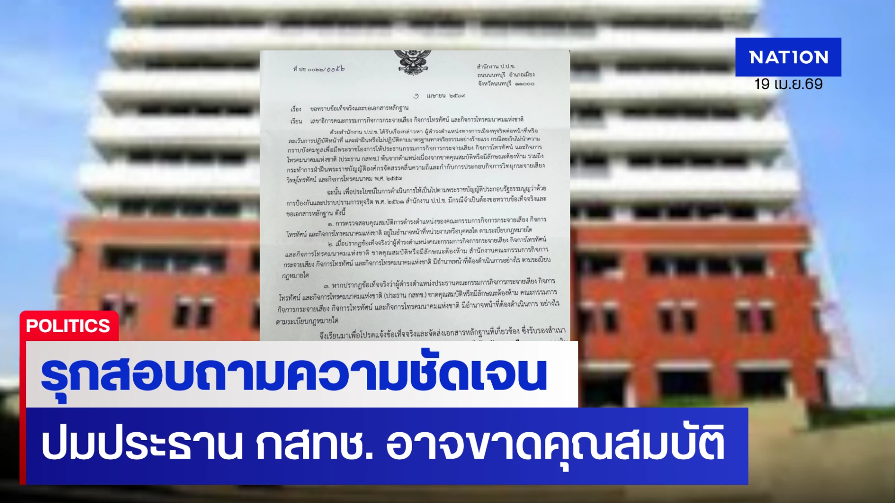 - 1 เม.ย. 2569 สำนักงาน ป.ป.ช. ทำหนังสือถึงเลขาธิการ กสทช. ขอทราบข้อเท็จจริงและเอกสารหลักฐาน พร้อมกำหนดส่งข้อมูลภายใน 15 วัน