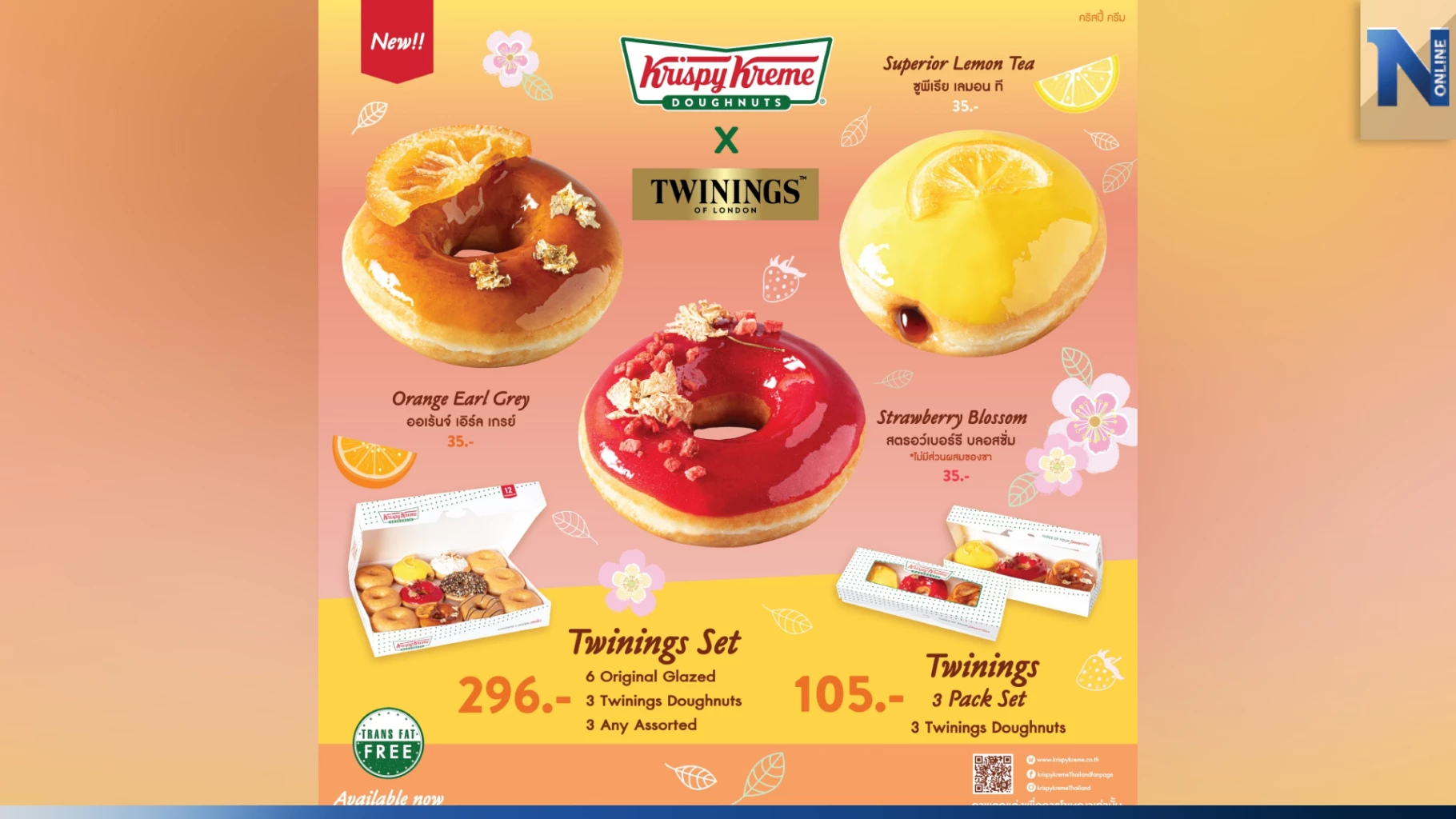 มาลิ้มลองรสชาติสุดพิเศษครั้งแรกในไทย ที่ยากจะลืมของ “คริสปี้ ครีม x ทไวนิงส์ โดนัท” (Krispy Kreme x Twinings Doughnuts) ในราคาเพียงชิ้นละ 35 บาท หรือแบบแพ็ก 3 ในราคา 105 บาท (ทไวนิงส์ โดนัท 3 ชิ้น) หรือจัดเต็มความอร่อยกับแบบเซ็ต ในราคาเพียง 296 บาท (ออริจินัล เกลซ 6 ชิ้น, แอสซอร์ทเตท 3 ชิ้น และทไวนิงส์ โดนัท 3 ชิ้น) ตั้งแต่วันที่ 6 มิถุนายน - 16 กรกฎาคม 2566 ณ ร้านคริสปี้ ครีม กว่า 50 สาขา ทั้งกรุงเทพฯ และต่างจังหวัด (ราคาดังกล่าว ยกเว้น สาขาสนามบินสุวรรณภูมิ และสนามบินดอนเมือง) หรือสั่งผ่านแอปพลิเคชัน ฟู้ดเดลิเวอรี่
