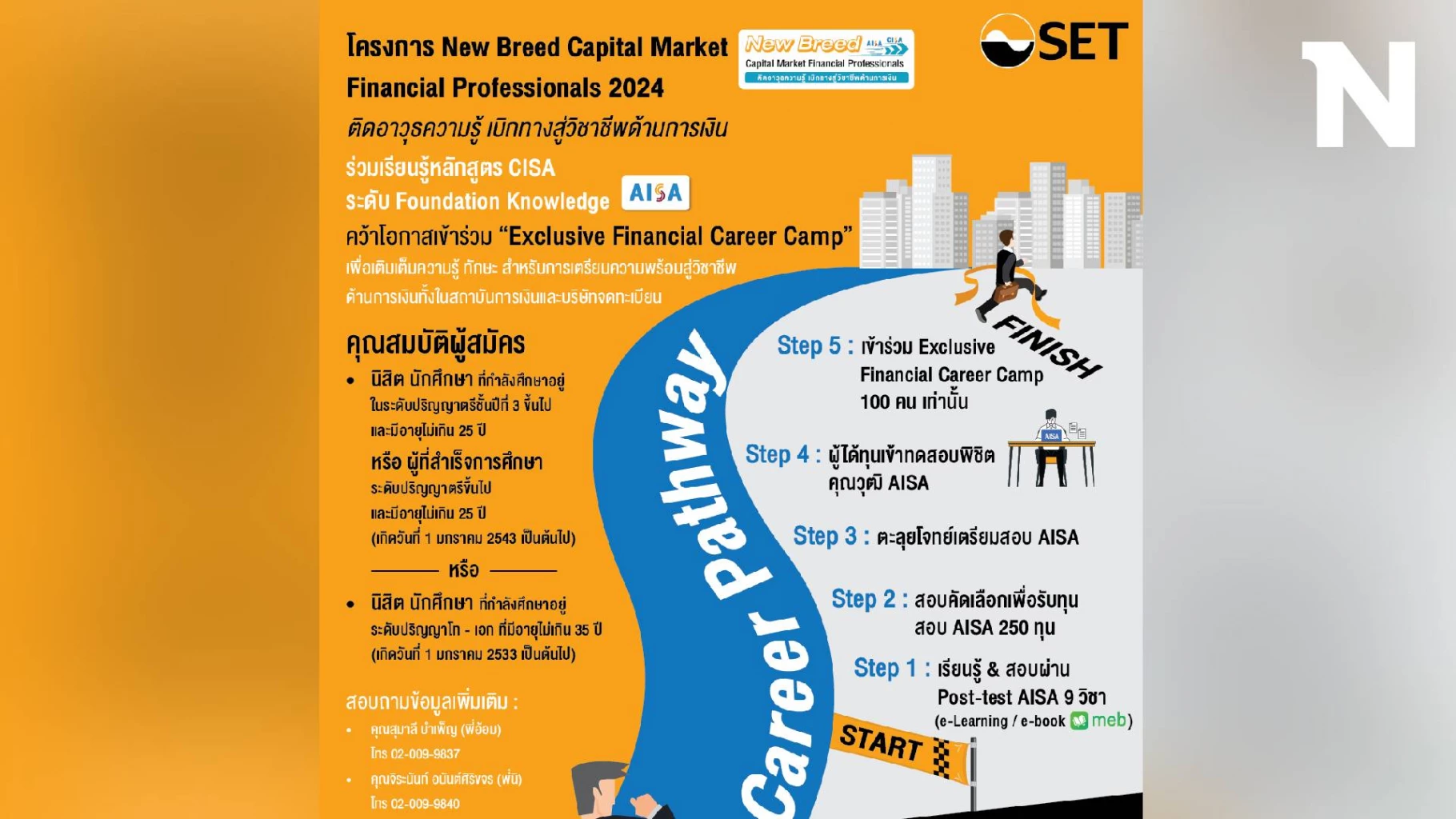 ตลาดหลักทรัพย์ฯ เชิญชวนนิสิตนักศึกษา เข้าร่วมโครงการ “New Breed Capital Market Financial Professionals 2024” เรียนรู้การวิเคราะห์ทางการเงินและการจัดการลงทุนในหลักสูตร Certified Investment and Securities Analyst ระดับ Foundation Knowledge หรือเรียกว่า คุณวุฒิ AISA
