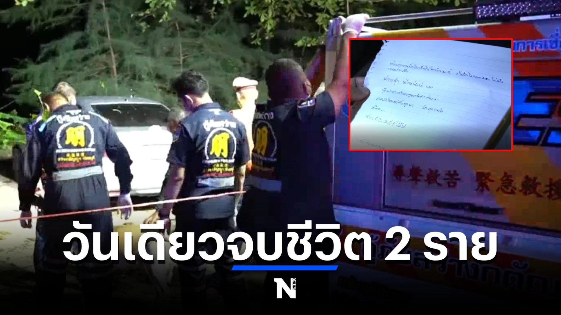 และในที่เกิดเหตุพบจดหมายลาตาย 1 ฉบับเขียนว่า “...ขอโทษทุกคนที่ต้องตัดสินใจทำแบบนี้ มันมืดไปหมด มองไม่เห็นทางออกทางอื่น ขอโทษนุ๊ก ขอโทษพ่อแม่ แมะ นุ๊กเค้าฝากตัวเองดูแลนินจาด้วยนะ ถ้ามีเมียใหม่อย่าทิ้งลูกนะรักสุดดวงใจ ขอโทษ...”
