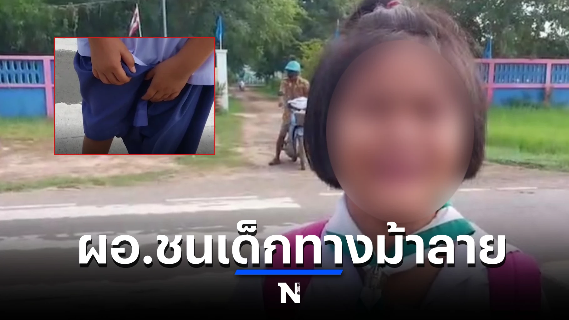 ในจังหวะนั้นเองได้มีรถจักรยานยนต์ซึ่งทราบว่าคนขับเป็นอดีต ผอ.โรงเรียนวังข่า ตำบลช่างปี่ ขับขี่มาโดยที่ไม่ได้จอด ทำให้รถชนเข้าไปที่ลำตัวของน้องจนเซเสียหลักล้มลงทั้งยืน ผู้เป็นตาเลยรีบลงจากรถไปนำหลานรีบไปส่งโรงพยาบาลสุขภาพตำบลบ้านนาฮัง-นาแกเพื่อทำการรักษาบาดแผลที่ถลอกตามแขนขา หลังจากนั้นก็เดินทางกลับโดยไม่ได้ไปเอกซเรย์แต่อย่างใด