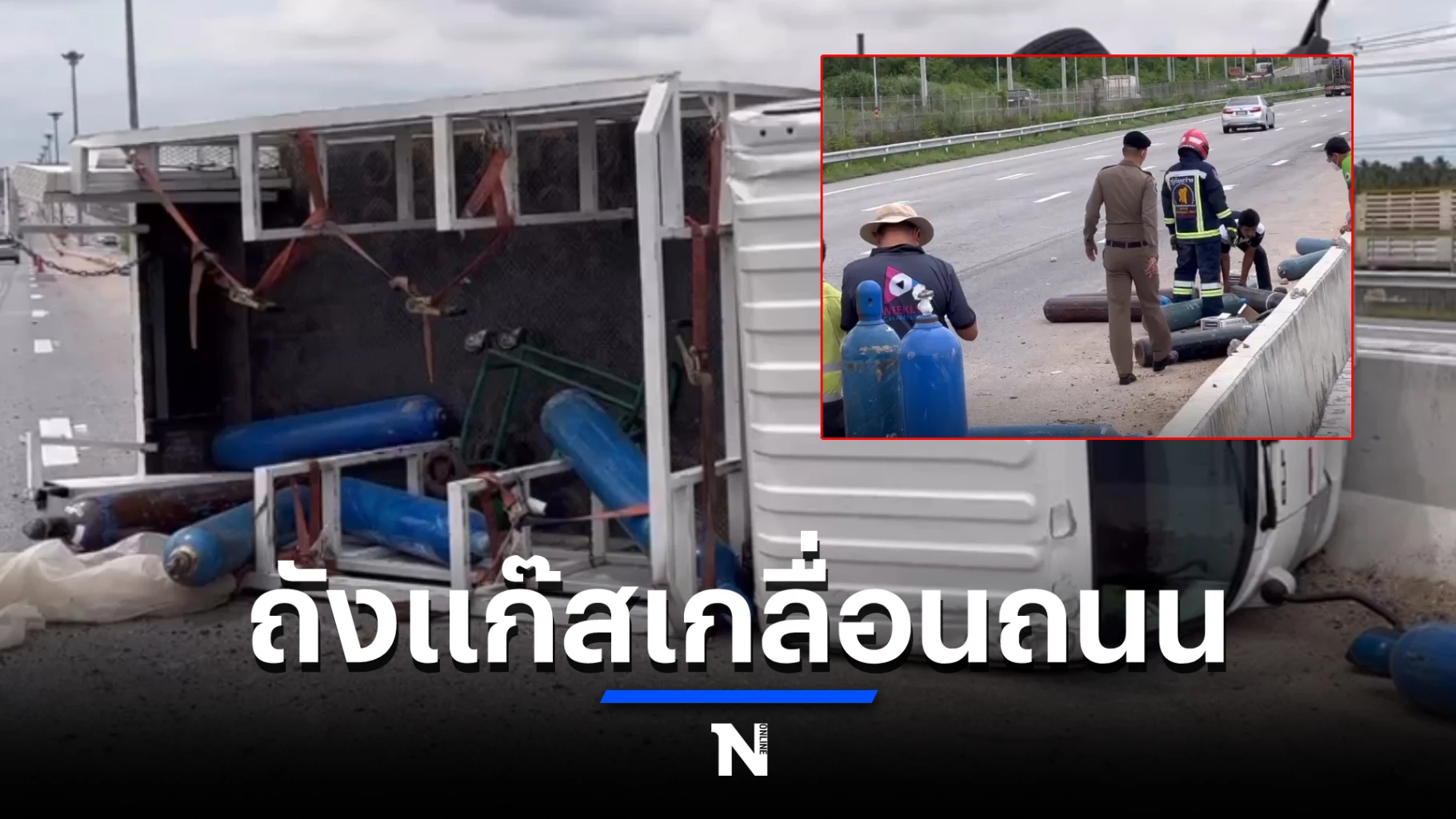 ที่เกิดเหตุพบรถยนต์กระบะสี่บรรทุก ยี่ห้อ อีซูซุ เอ็น เเอล อาร์ 130 หมายเลขทะเบียน 3ฒน 7972 กรุงเทพมหานคร อยู่ในสภาพพลิกคว่ำ ตะแคงข้าง อยู่ติดกับแบริเออร์ เกาะกลางถนน ล้อหลังข้างซ้ายแตก มีถังแก๊ส จำนวน 35 ถัง ถังละ 20 กิโลกรัม ซึ่งภายในบรรจุแก๊ส ซีโอทูล และ แก๊ส ฮีเลี่ยม กระเด็นกระจัดกระจายเกลื่อนถนน เจ้าหน้าที่ได้เคลื่อนย้าย เข้าข้างทาง เพื่อความปลอดภัย จากการตรวจสอบมีหนึ่งรั่ว เจ้าหน้าที่กู้ภัยฯเข้าทำการเก็บกู้อยู่จนในความปลอดภัย