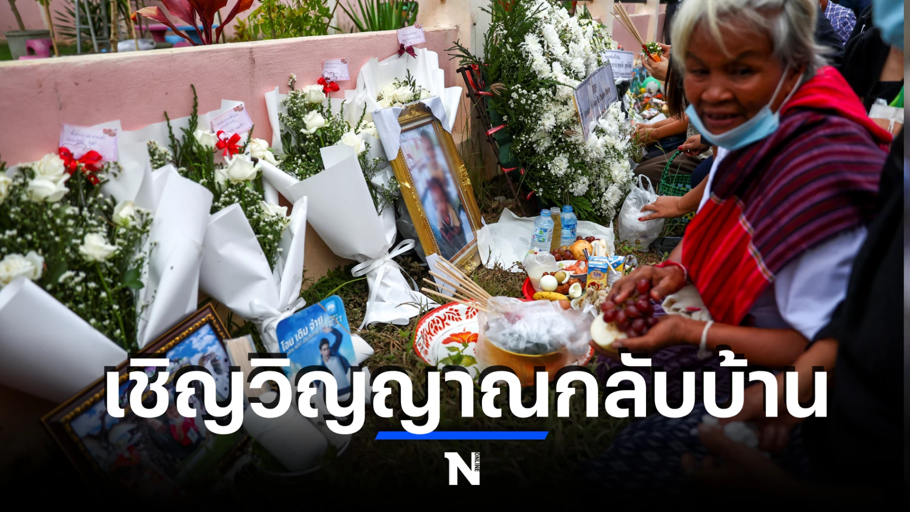 บรรยากาศเป็นไปอย่างโศกเศร้า ญาติพี่น้องครอบครัวผู้เสียชีวิต จุดธูปคนละ 1 ดอกภายหลังนำเครื่องเซ่นมาร่วมในพิธีเชิญดวงวิญญาณ ทั้งอาหาร น้ำดื่ม ของเล่น และดอกไม้ที่ผู้เสียชีวิตชอบ ก่อนที่พระอาจารย์ไกรษร จะทำพิธีนำสวดเพื่อเชิญดวงวิญญาณ ก่อนจะหอบใส่ผ้าขนหนูที่ญาติเตรียมมา ห่อดวงวิญญาณไว้ในอ้อมกอด และโปรยทานด้วยเงินเหรียญ เพื่อขอเปิดทางจากภูตผีปีศาจและเจ้าที่เจ้าทาง ให้ดวงวิญญาณผู้เสียชีวิตกลับไปสู่ภพภูมิที่ดีตามความเชื่อ ซึ่งในขณะที่พระสงฆ์นำสวดนั้น มีกลุ่มก้อมเมฆก้อนใหญ่ก่อตัวปผกคลึมอยู่เหนือ อบต.อุทัยสวรรค์ ก่อนจะมีฝนปรอยลงมาไม่ถึง 5 นาที ก็มีเสียงฟ้าร้อง ก่อนที่จะมีลมพัดมาในขณะที่สวด