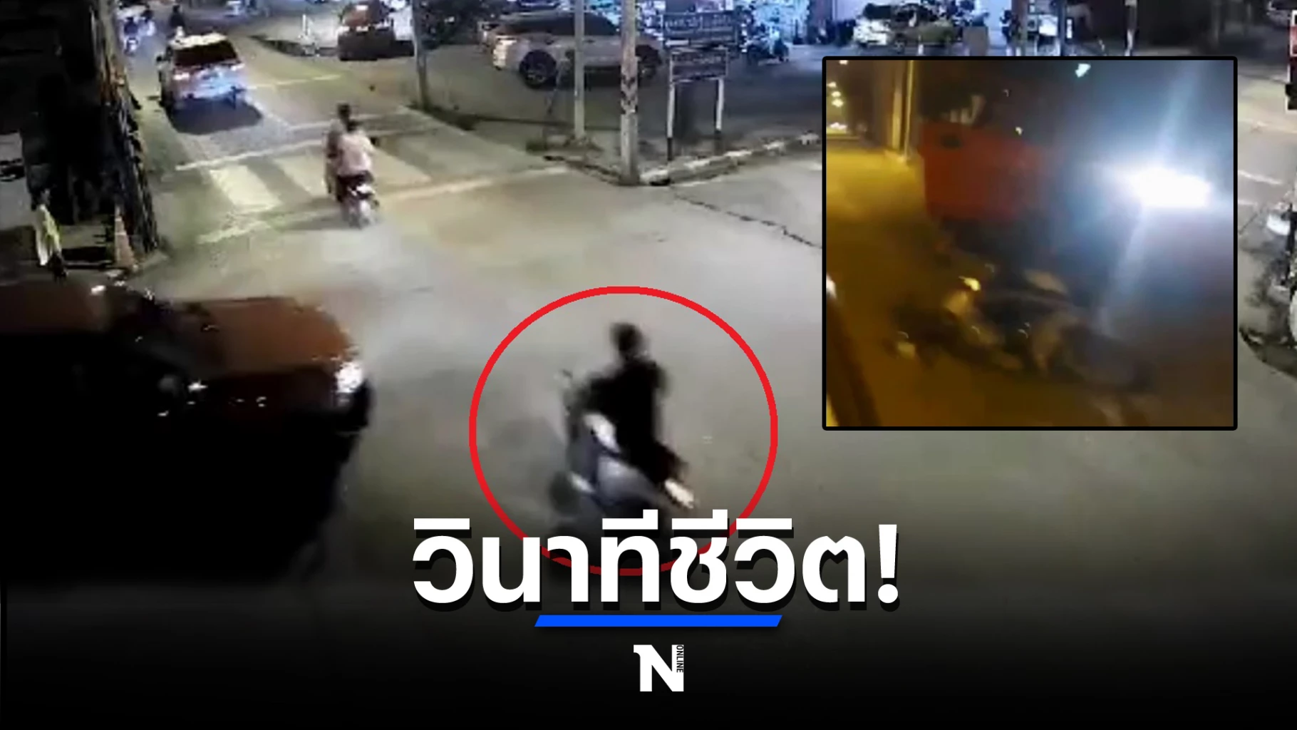 ชมคลิป >> วงจรปิดจับภาพนาทีชีวิต กระบะคลั่งชนจยย. หวิดเหยียบซ้ำ แล้วซิ่งหนี เร่งไล่ล่าตัว