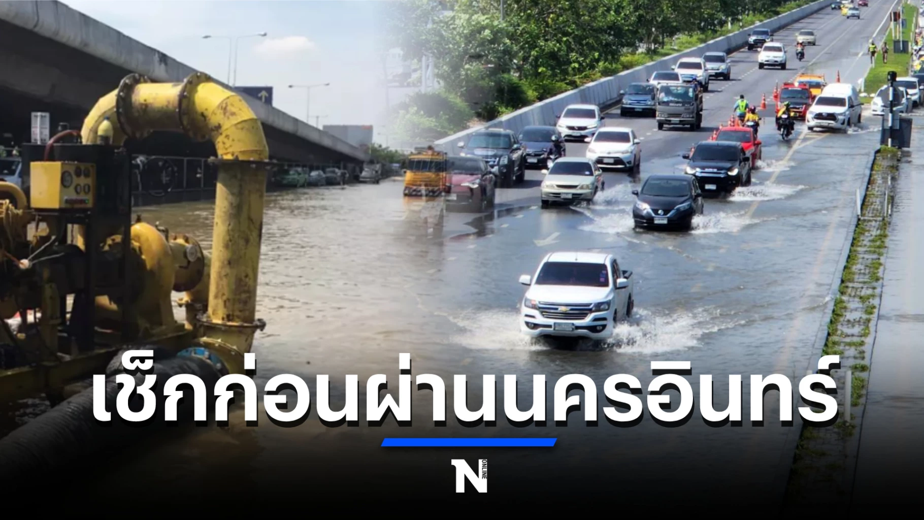 ล่าสุดวันนี้ ผู้สื่อข่าวลงพื้นที่จุดกลับรถ ถนนนครอินทร์ เขตบางศรีเมือง ต.บางไผ่ อ.เมืองนนทบุรี พบว่า บนถนนนครอินทร์ จากแยกบางศรีทอง ขาเข้า มุ่งหน้าสะพานพระราม 5 น้ำเอ่อล้นเข้าท่วมช่องทางคู่ขนาน เต็มพื้นที่ 2 ช่องจราจร ระดับน้ำสูง 20 - 40 ซม. รถเล็กไม่สามารถผ่านได้ การจราจรติดสะสมกว่า 1 กม. ส่วนช่องทางด่วนพบว่า น้ำท่วม 2 ช่องจราจร ระดับน้ำ 10 - 15 ซม. การจราจรชะลอตัว มีรถสะสมจากสะพานข้ามแยกบางสีทอง แต่เคลื่อนตัวได้โดยใช้ช่องทางขวาสุด