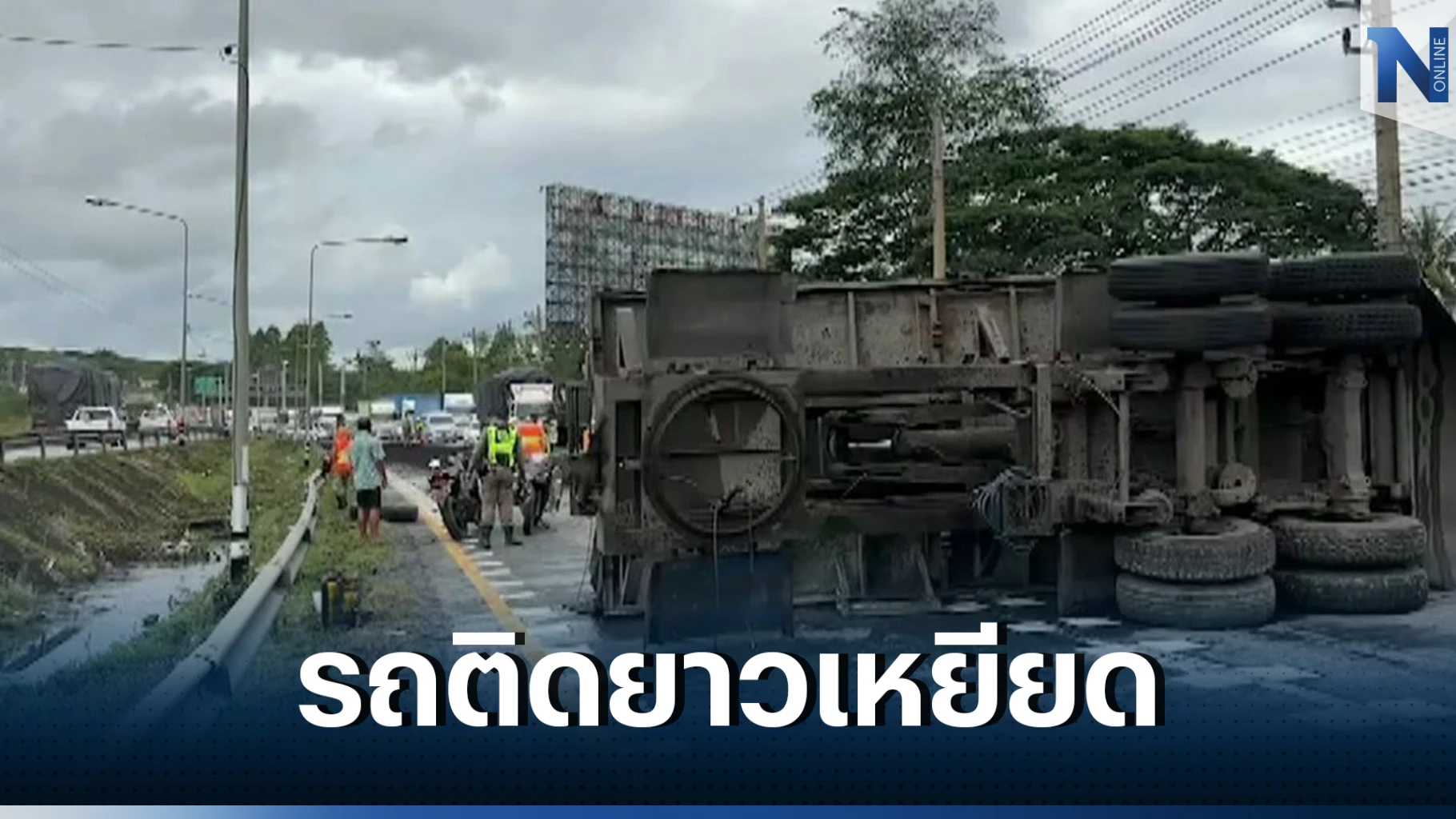 รถพ่วง 18 ล้อ พลิกคว่ำ! เทกระจาดแร่หินเกลื่อนถนนมิตรภาพ รถติดยาว 5 กม.