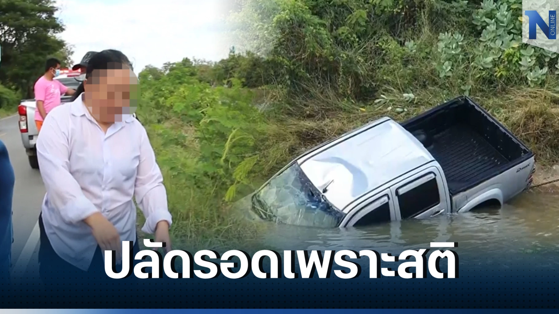 สติล้วน ๆ ปลัดสาวอำเภอโนนแดง ขับกระบะเสียพุ่งลงคลองส่งน้ำจมมิดทั้งคัน โชคดีที่ยังมีสติ ใช้เหล็กทุบกระจกหนีตายรอดหวุดหวิด