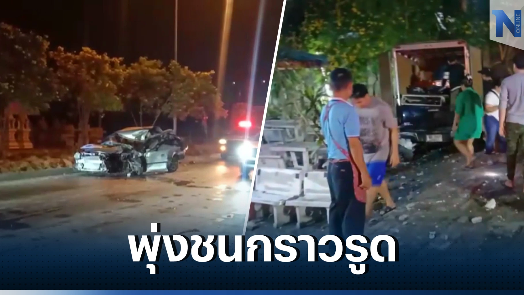 รถยนต์เก๋งพุ่งชนจักรยานยนต์ ก่อนเสียหลักชนรถจอดข้างทางระเนระนาด รถที่ถูกชนพุ่งเข้าร้านข้าวต้ม ผู้บาดเจ็บ 5 ราย ตำรวจเร่งเช้กวงจรปิด รอสอบปากคำคนขับคันก่อเหตุที่ได้รับบาดเจ็บ หาสาเหตุที่แท้จริง
