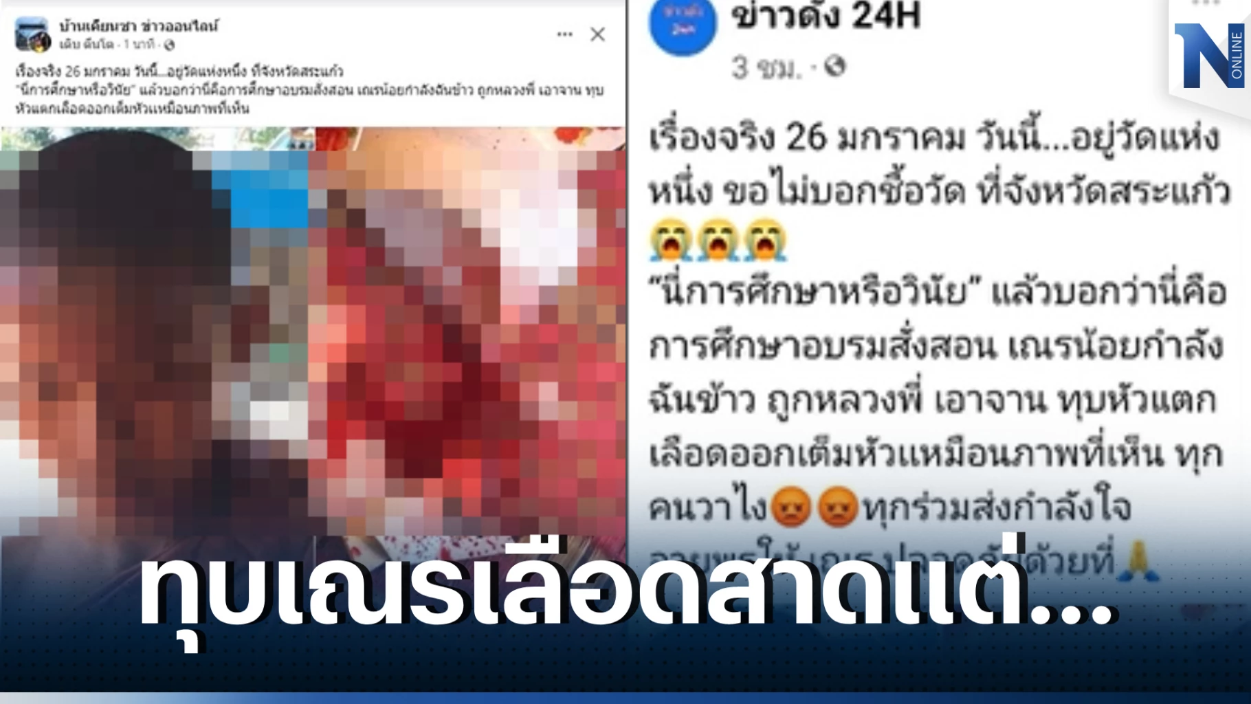 เช่นเดียวกัน เพจบ้านเคียนซา ข่าวออนไลน์ ที่เมื่อช่วงบ่ายของวันนี้ โพสต์ระบุด้วยว่า "เรื่องจริง 26 มกราคม วันนี้...อยู่วัดแห่งหนึ่ง ที่จังหวัดสระแก้ว“นี่การศึกษาหรือวินัย” แล้วบอกว่านี่คือการศึกษาอบรมสั่งสอน เณรน้อยกำลังฉันข้าว ถูกหลวงพี่ เอาจาน ทุบหัวแตกเลือดออกเต็มหัวเหมือนภาพที่เห็น"