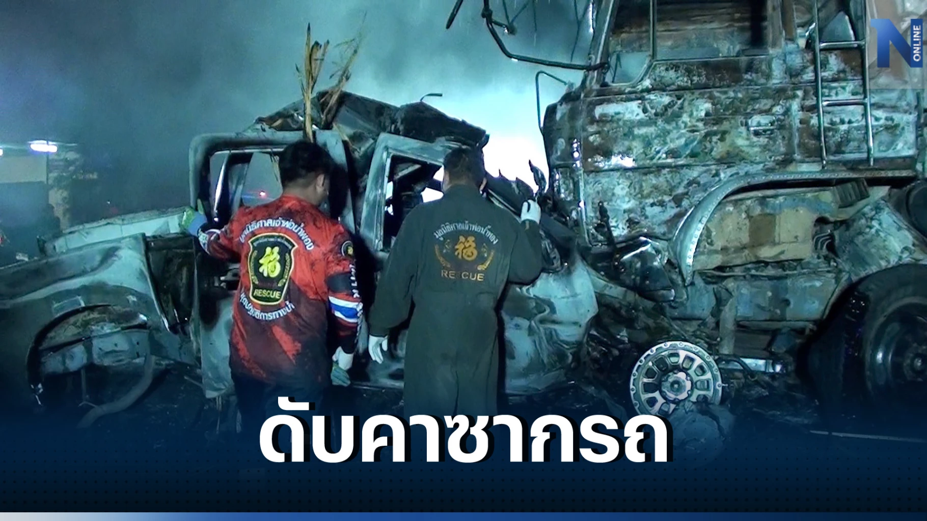 ในที่เกิดเหตุพบว่า รถบรรทุกอ้อย ยี่ห้อฮีโน่สีขาว ทะเบียนหมวดจังหวัดขอนแก่น บรรทุกอ้อยกกำลังไปส่งโรงงานน้ำตาลเต็มคันรถ วิ่งมาจากอำเภอกระนวนมุ่งหน้าอำเภอน้ำพอง ที่เกิดเหตุเป็นเนินลาดชัน ได้มีรถกระบะอีซุซุสีขาว ทะเบียนจังหวัดขอนแก่น พุ่งเข้ามาชนประสานงาอย่างจัง ทำให้เกิดเพลิงลุกไหม้ในเวลาต่อมา ใกล้กันนั้นประมาณ 3 เมตร พบรถจักรยานยนต์วิบาก ไม่ทราบยี่ห้อถูกไฟไหม้เสียหายทั้งคัน