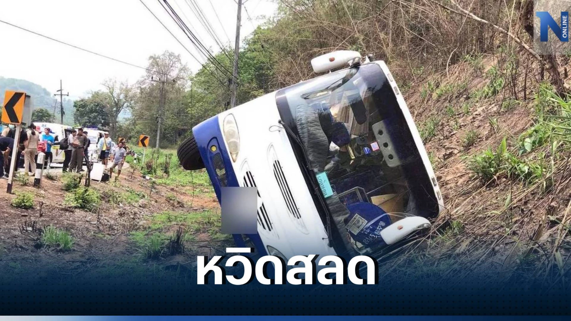 ระทึก รถบัสทัวร์จีนยางแตกตกถนน ตะแคงพิงเนินเขาข้างทาง เจ็บเล็กน้อย 8 ราย